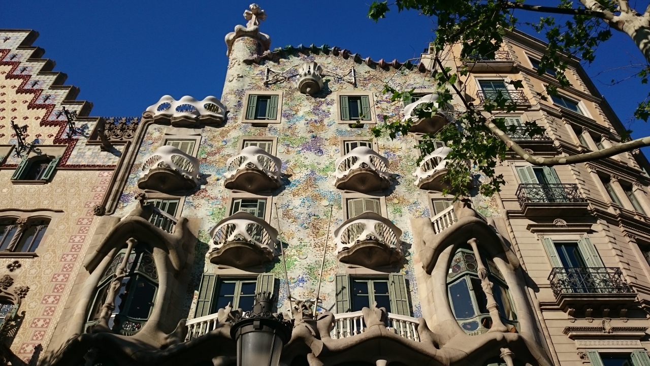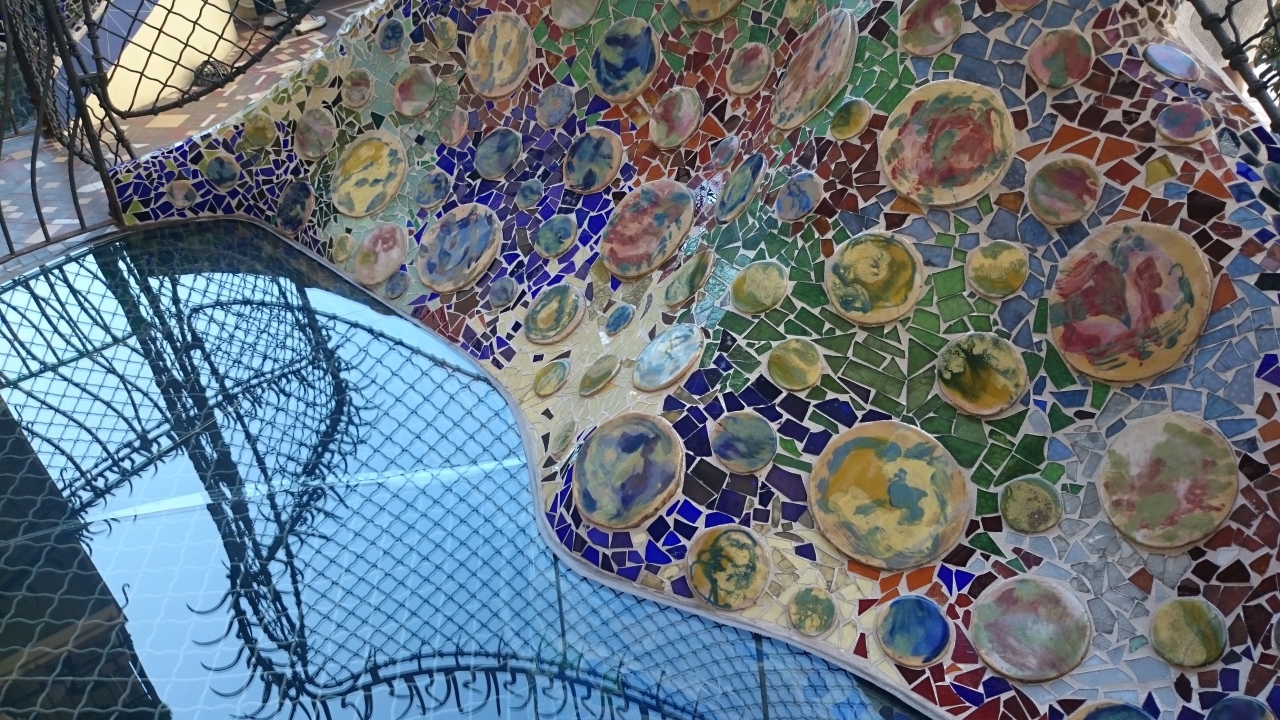 ネットで時間指定チケットを購入し、朝イチでいきました。建物の正面が北東を向いているため、晴れた日に写真を撮るなら朝日があたる時間帯がねらい目です。幸い当日は晴天に恵まれ、破砕タイルのキラキラした壁、昆虫の目のようなベランダを写真におさめることができました。