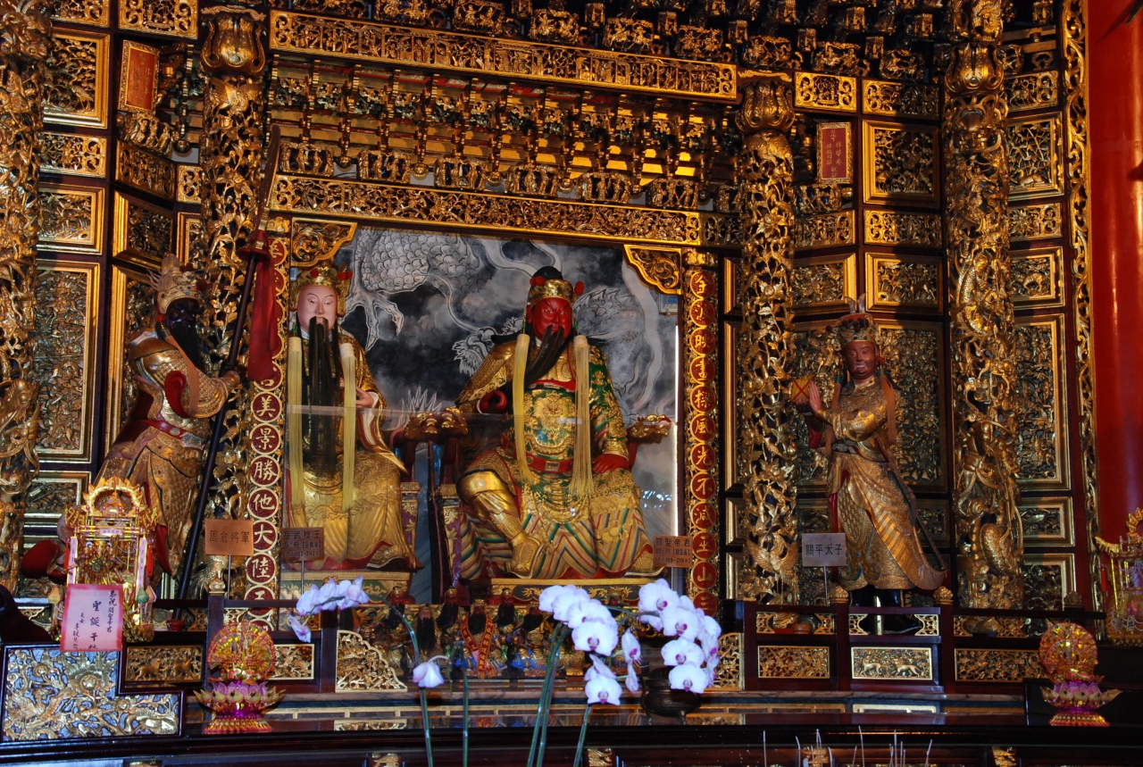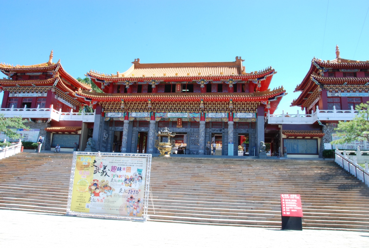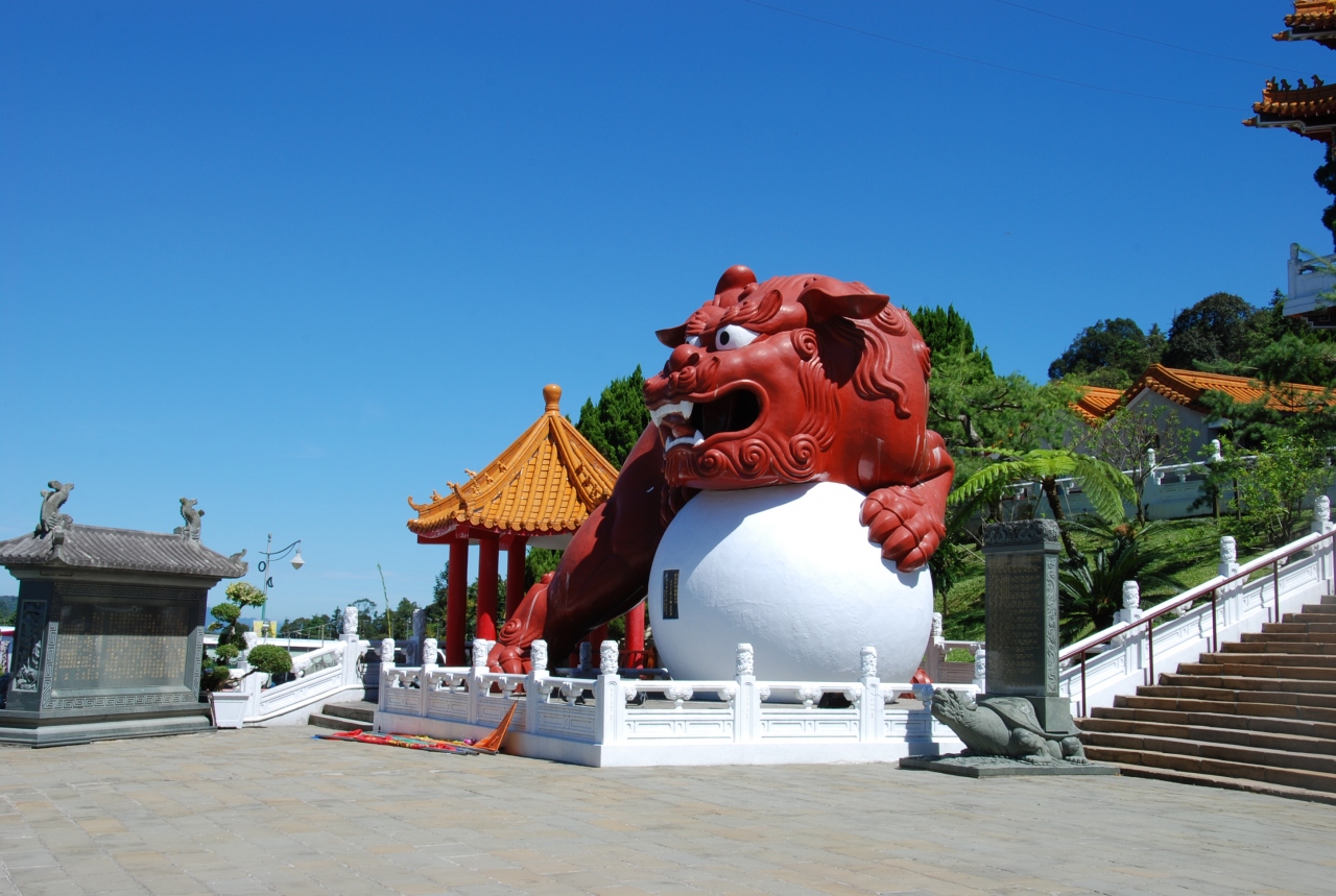 日月潭のすぐそばにあるカラフルな寺院です。まず、派手な背の高い門から入ります。やや左側には大きな白い玉の上にしがみついている赤い獅子がお出迎えしてくれます。お堂の屋根は沖縄の首里城のように鮮やかな朱色です。幅の広い階段を上がっていくと右手に黄金の玉を追う竜が彫られているモニュメントがあります。お堂の天井もとても色彩豊かな装飾が施されています。本堂の中の祭壇には、金色の派手な衣装をまとった像が2体鎮座しています。本堂の脇にはお土産屋があり、お守りの他にCDやDVDも販売しています。私は今は亡き歌手のCD組のセットを買いました。