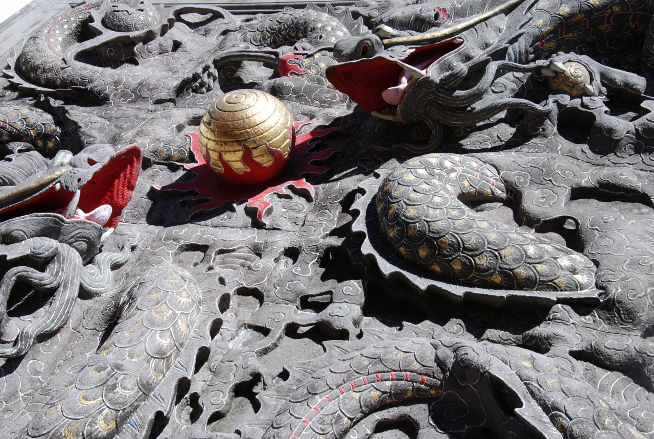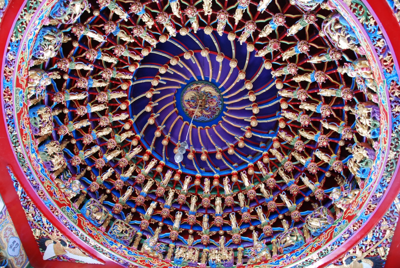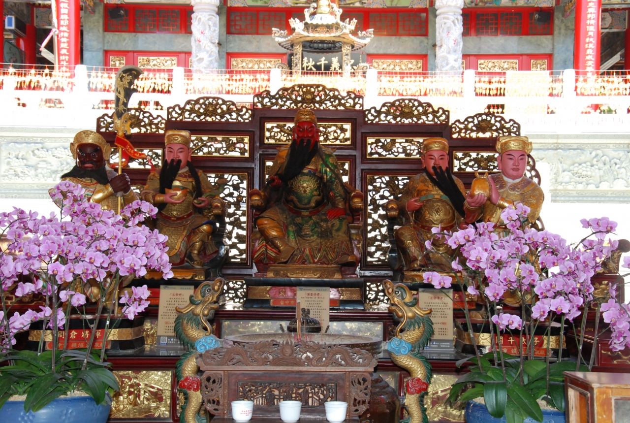 日月潭のすぐそばにあるカラフルな寺院です。まず、派手な背の高い門から入ります。やや左側には大きな白い玉の上にしがみついている赤い獅子がお出迎えしてくれます。お堂の屋根は沖縄の首里城のように鮮やかな朱色です。幅の広い階段を上がっていくと右手に黄金の玉を追う竜が彫られているモニュメントがあります。お堂の天井もとても色彩豊かな装飾が施されています。本堂の中の祭壇には、金色の派手な衣装をまとった像が2体鎮座しています。本堂の脇にはお土産屋があり、お守りの他にCDやDVDも販売しています。私は今は亡き歌手のCD組のセットを買いました。