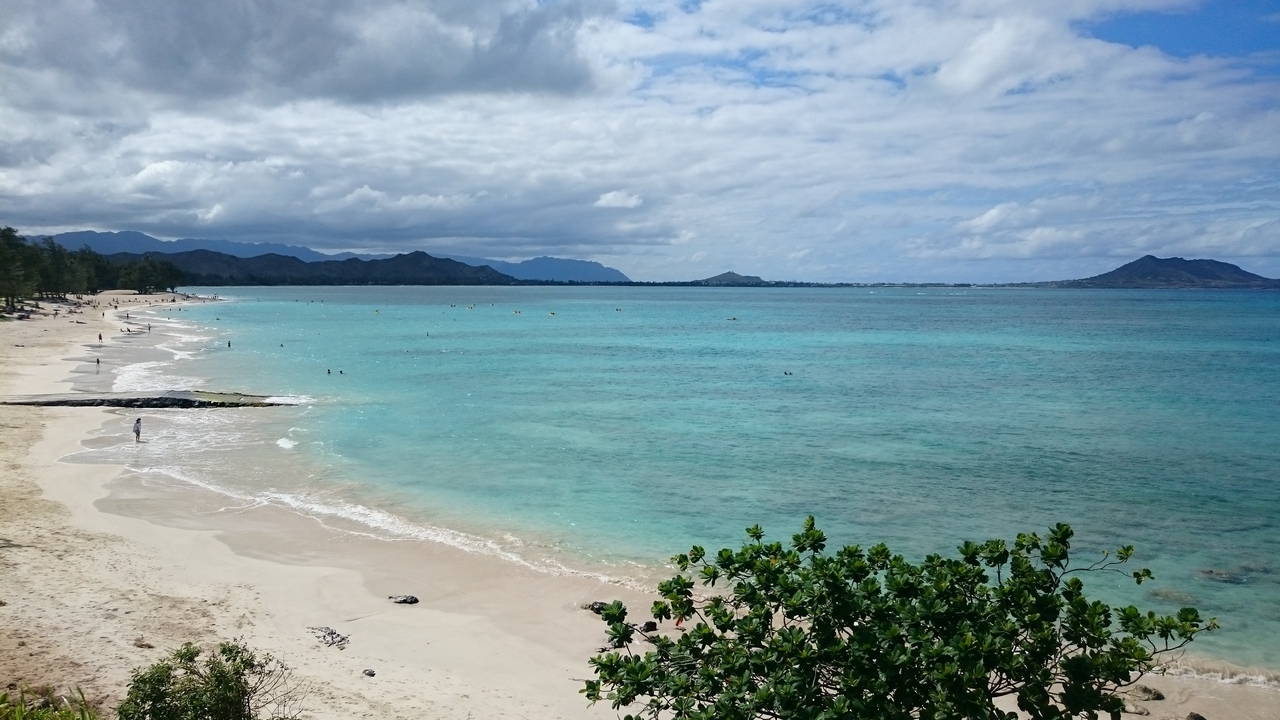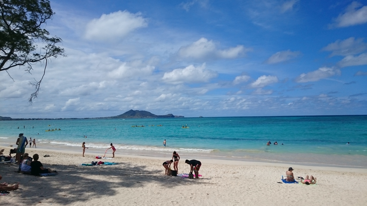 トレイル前にまずはカイルアビーチで裸足になって、さらさらの白い砂の感触を確かめました。