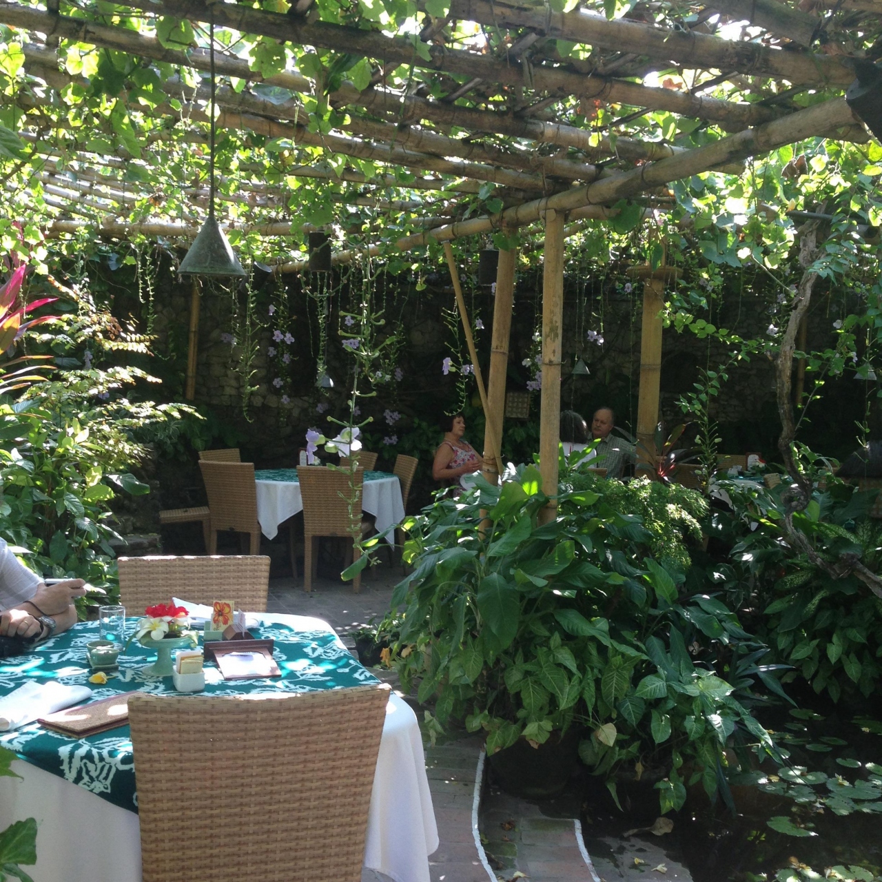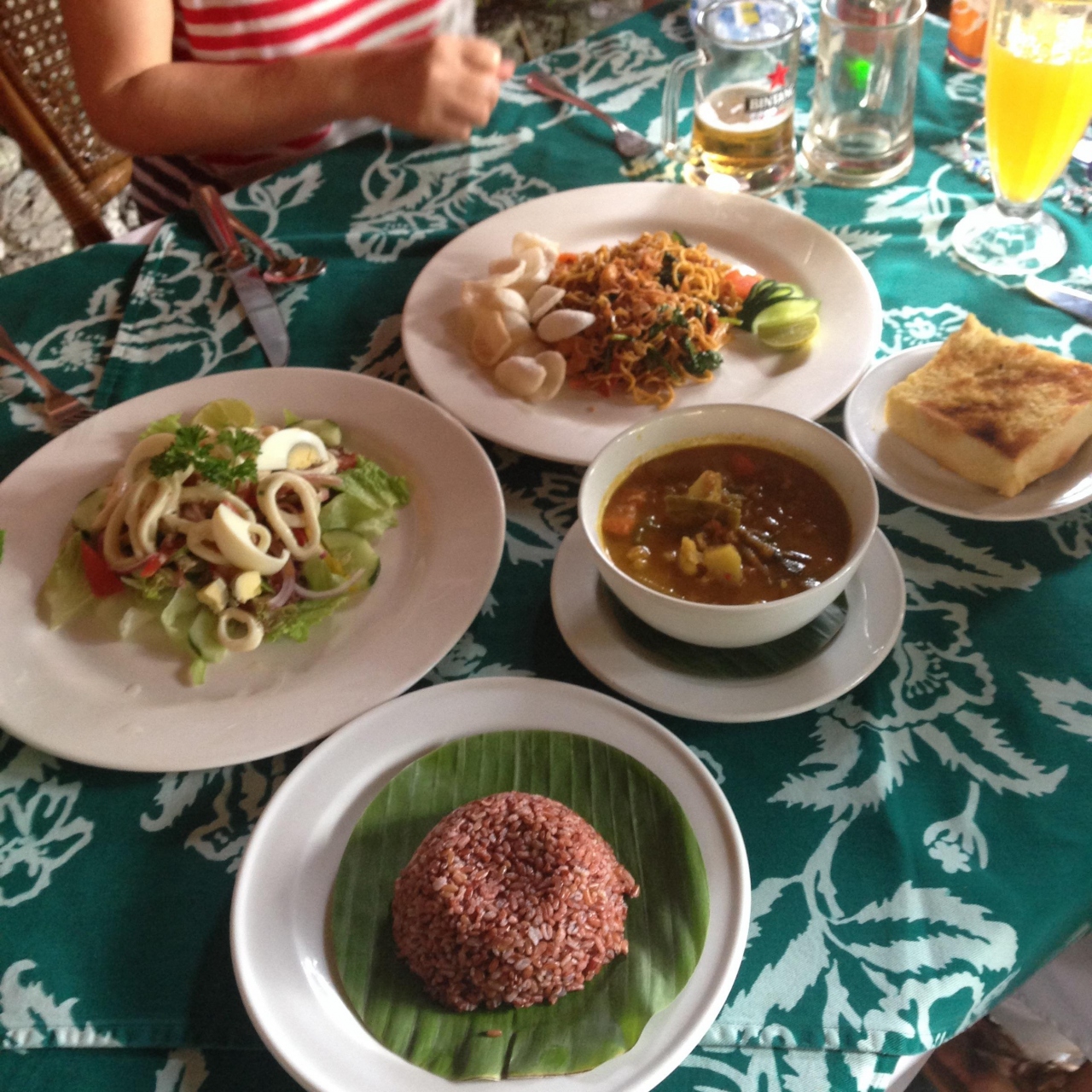 30年前に、初めて家族旅行でバリ島に来た時に入ったお店です。今回は、友人四人で訪れました。通りから路地に入るので、静かな雰囲気のガーデンレストランです。木陰がたくさんあるので炎天下ではないけれど、蒸し暑い時はちょっと暑いです。お料理は、いろいろあって、どれも美味しいと思いました。