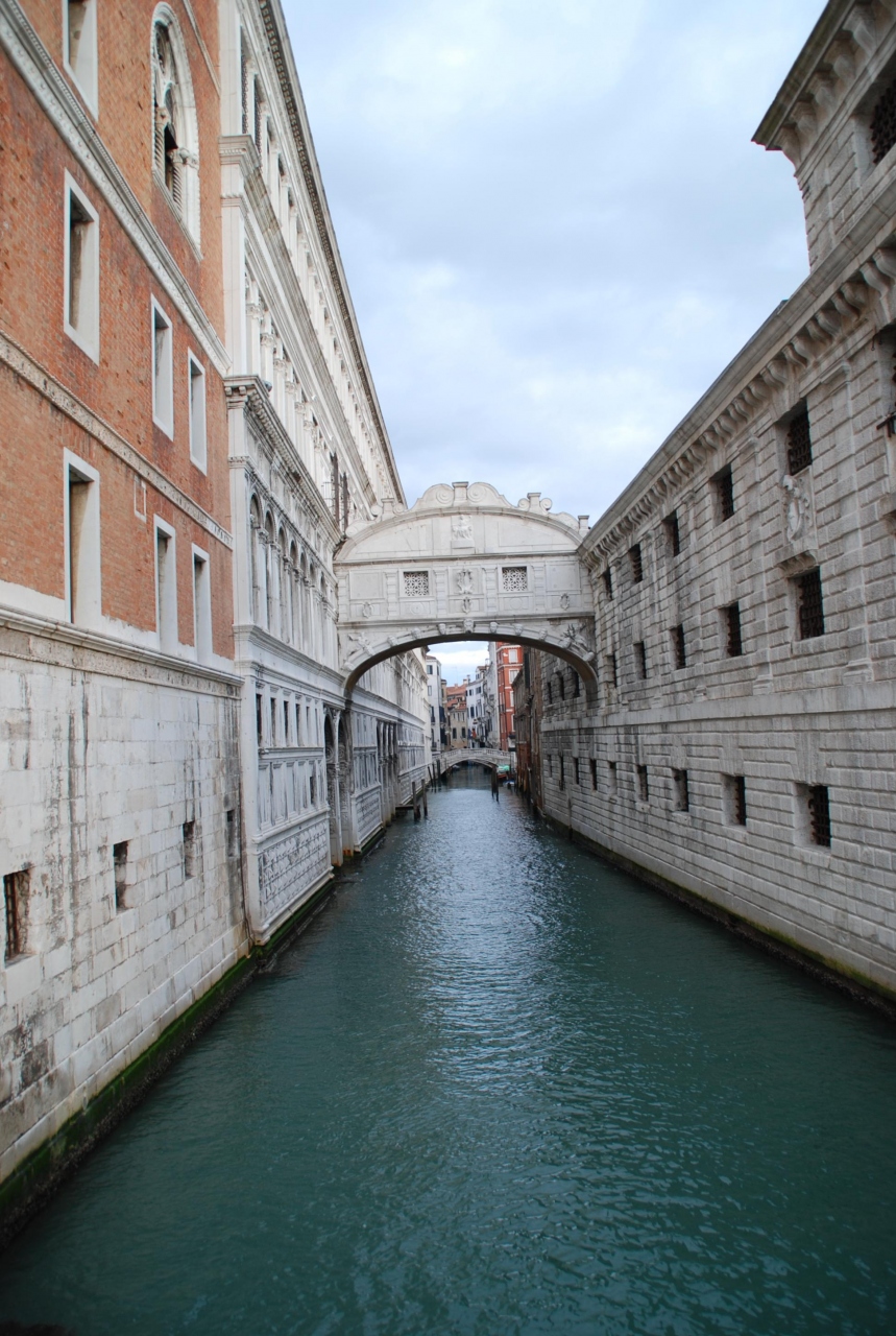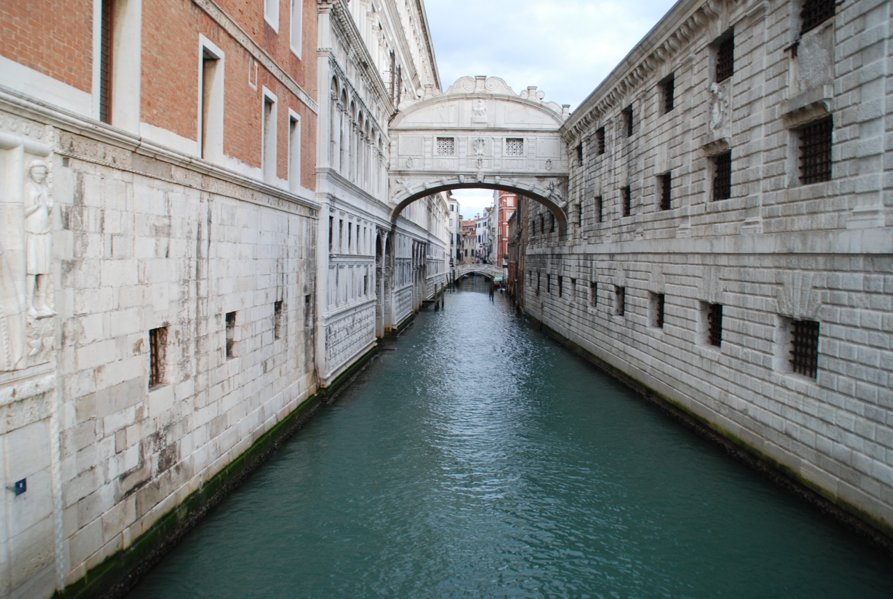 船着き場に着いてサンマルコ広場へ行く途中に右手に見えるのがこのため息橋です。現地ガイドさんの話を聞いていないと気が付かずに通り越してしまうほどです。白い大理石でできた橋で。窓には石でできた格子が入っているとのことですが、そこまでは確認できなかったです。橋の左側がドゥカーレ宮殿で右側が牢獄になっています。牢獄へ向かう囚人がこの橋を渡って窓から見えるヴェネツィアの美しい景色を見て、ため息をつくということからため息橋と名付けられたと、現地ガイドさんが説明してくれました。