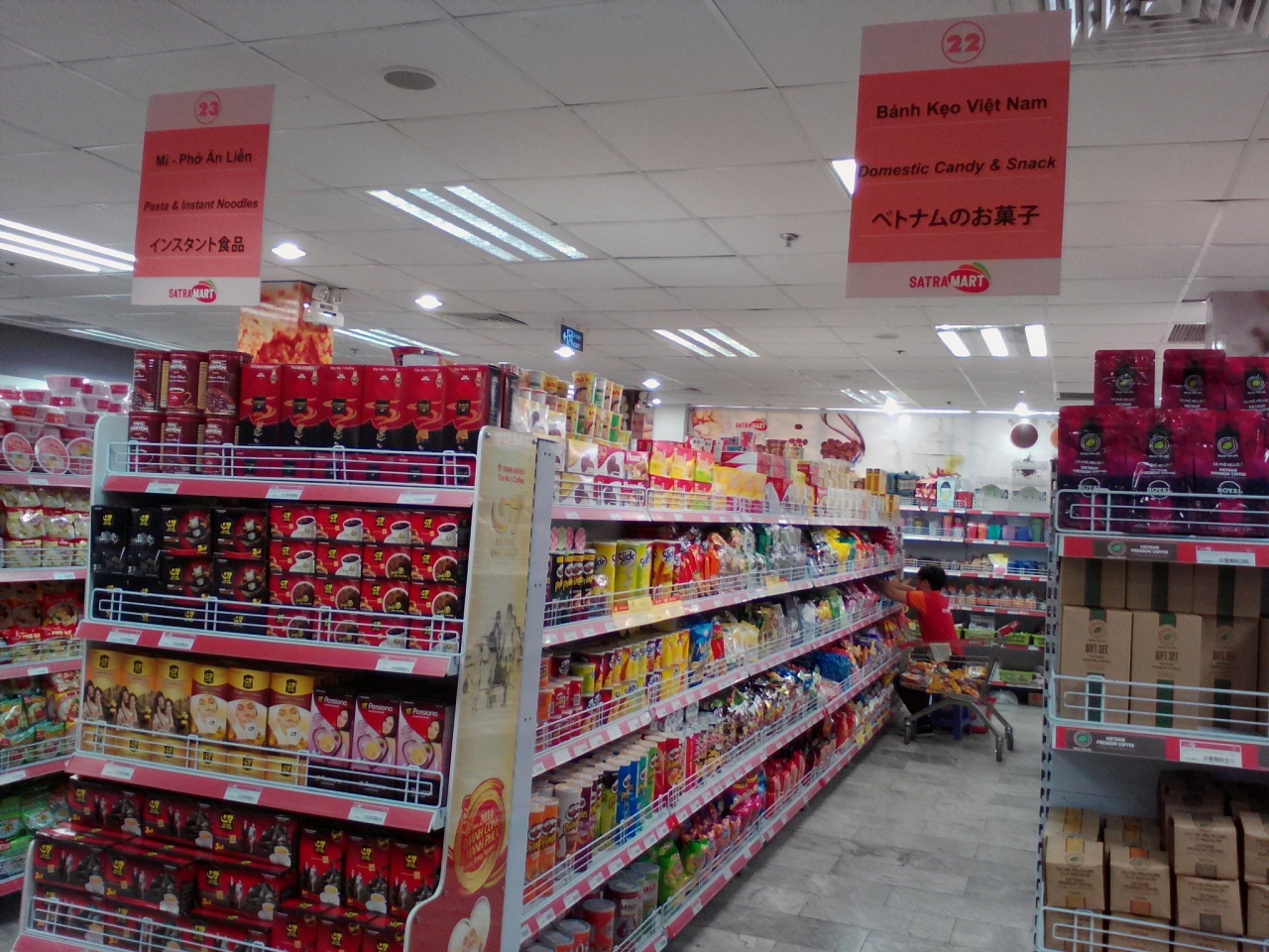グエンフエ通りとドンコイ通りに挟まれたラッキープラザ3階にあります。どちらの通りからでも入れます。スーパーとしては規模は大きくありませんが一通りは物は揃っているし手頃なサイズで買い物しやすいと思います。値段も安い、「333」缶ビールが1万ドン。どこのスーパーでもこの値段では売っていませんでした。商品売り場の入口にはご親切にも日本語で案内表示が書かれています。日本人客が多いということなんでしょうね。