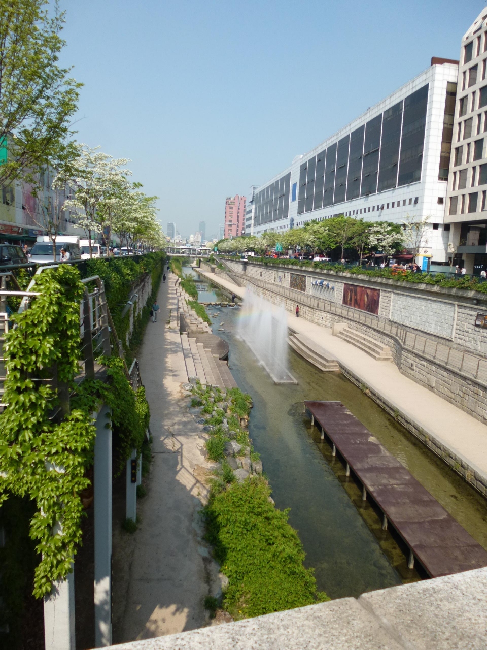清渓川は、ソウルの繁華街を東西に流れる川で、人気観光スポットの近くを通っています。私たちは東大門地区で川のほとりを歩いてみましたが、噴水が設置されるなど、気持ちの良い遊歩道が整備されています。川沿いには絵になる光景がたくさんあって楽しいです。