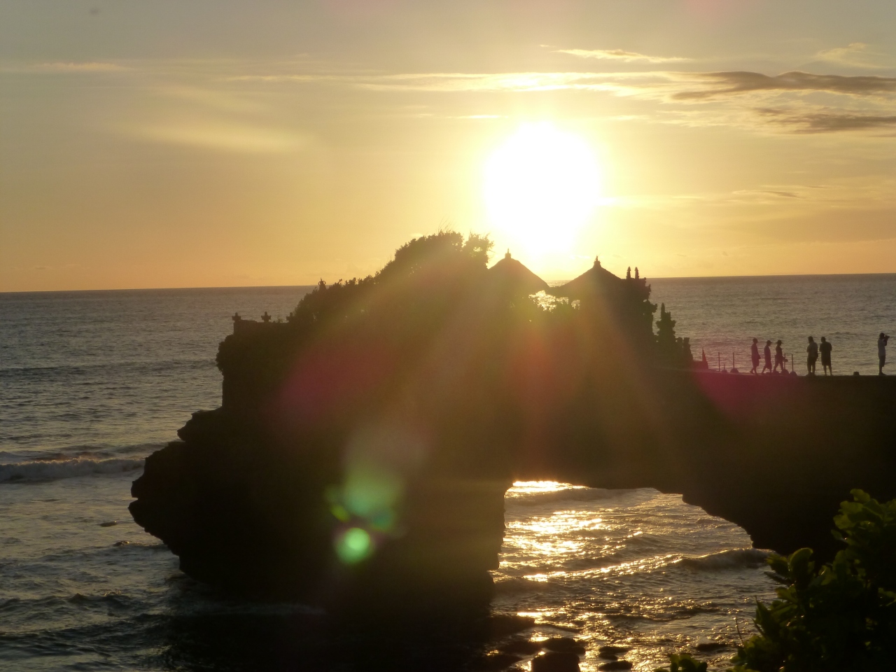 高台に到着すると干潮時なので「タナロット寺院」に参拝人が多数見えました(到着するのが干潮時だったのでお参りは無理でした,,) ただ`夕焼けが綺麗だ`と聞いていたので2,5時間待っていましたョ。タナロット寺院を始め、島々にお社がありますネ,,。いよいよ夕日……島/寺院/参拝人が夕焼けに当っているシルエット(^^)