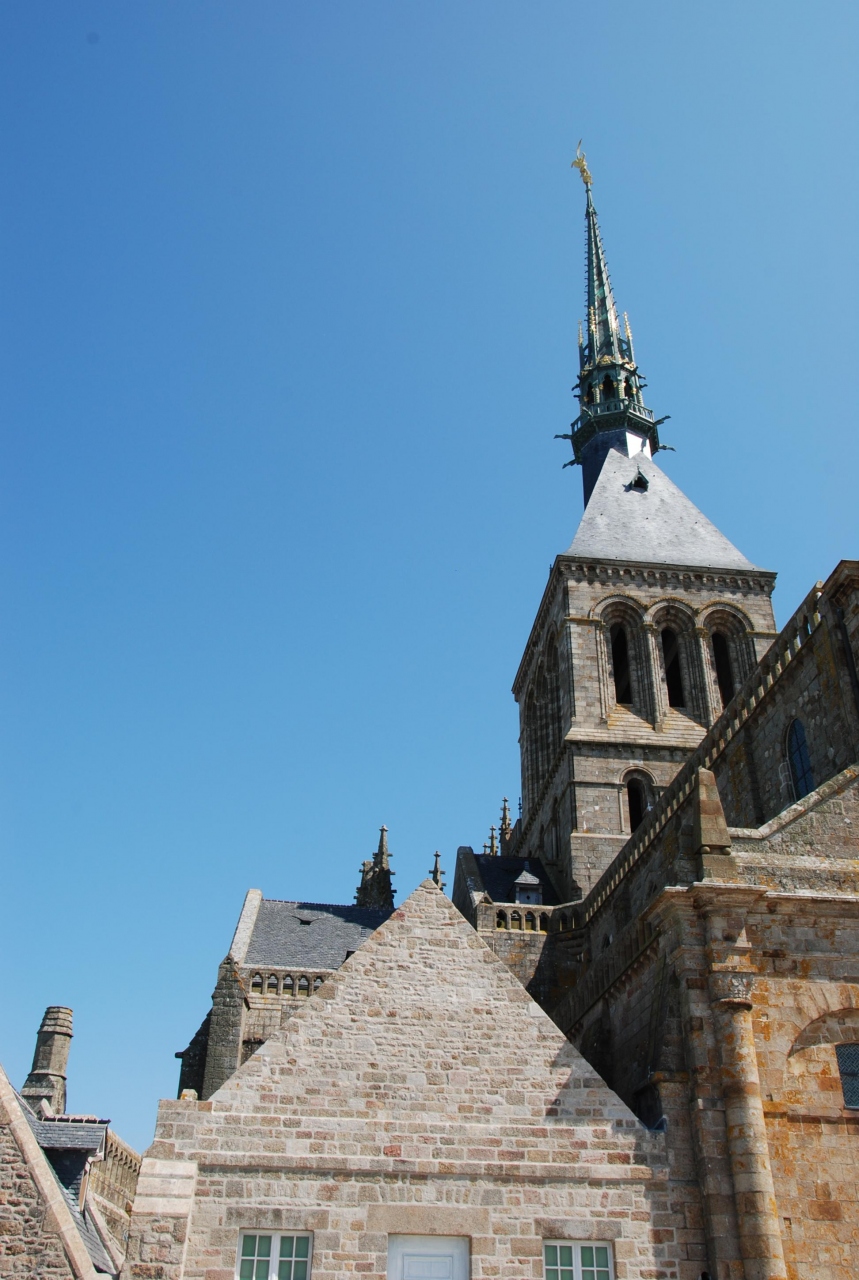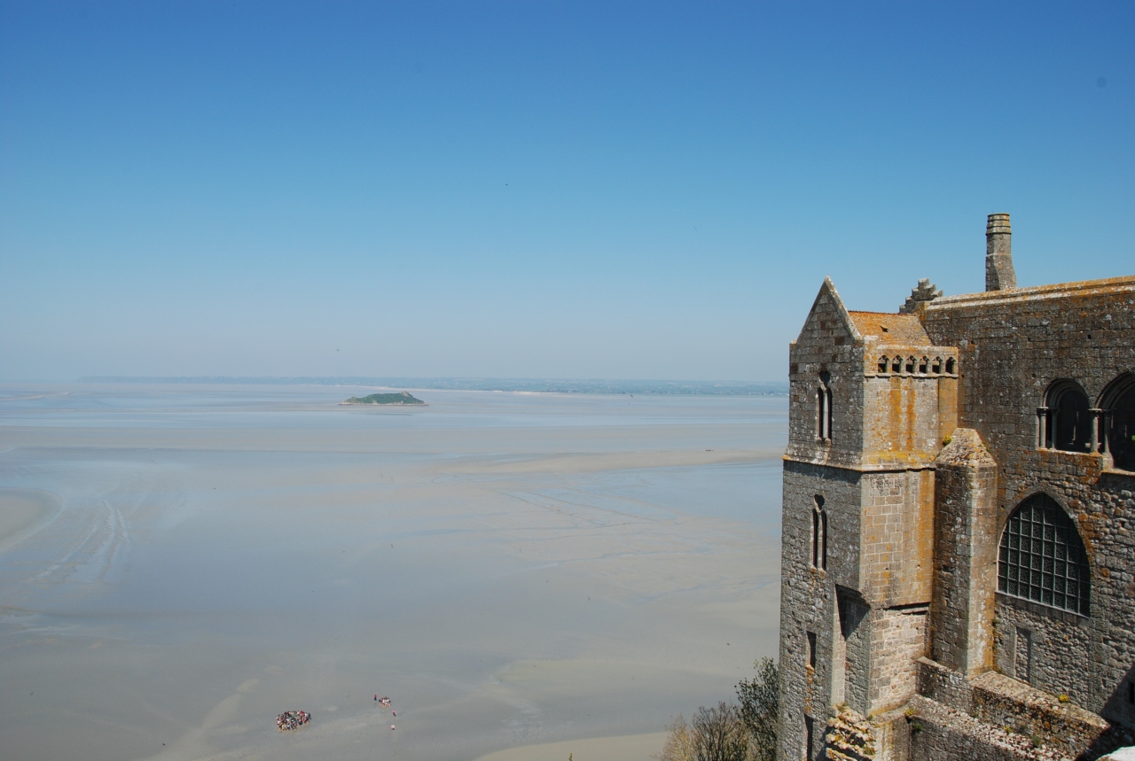 モンサンミッシェルへのシャトルバスが一時間に二・三本ほど出ていています。シャトルバスで橋を渡るのが便利ですが、徒歩で行くのは時間がかかるものの、修道院や周りの景色を見ながら歩くのもいいかもしれません。10人ほど乗れる馬車も出ています。修道院に入るには2メートル幅くらいの坂道を上がって行きます。通路のの両側にはお土産屋や飲食店が建ち並んでいます。初めは緩やかな坂道ですが、百メートルほど歩くとだんだん急な坂道になります。修道院の上まで行くと、見晴らしのよい広場があり、そこから望む海は素晴らしいです。振り返ると修道院のてっぺんに金色の聖ミカエル像が立っています。