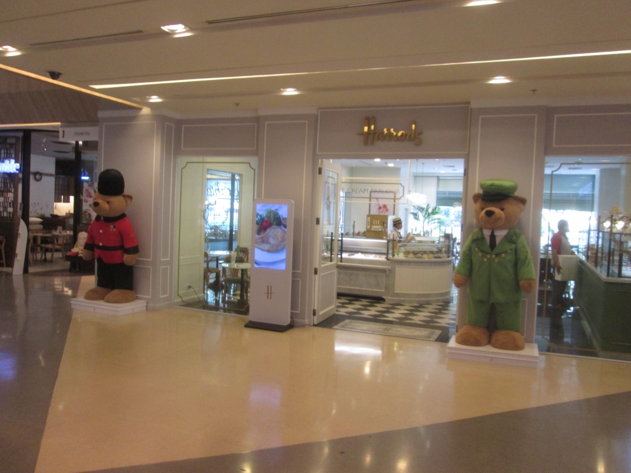 BTSプルンチット駅に直結しているショッピングセンター「ザマーキュリーヴィレ」の1階にイギリスの高級百貨店ハロッズが入っていました。シンボルである大きい熊がおしゃれな服を着て立っていました。店内は結構広いスペースでした。