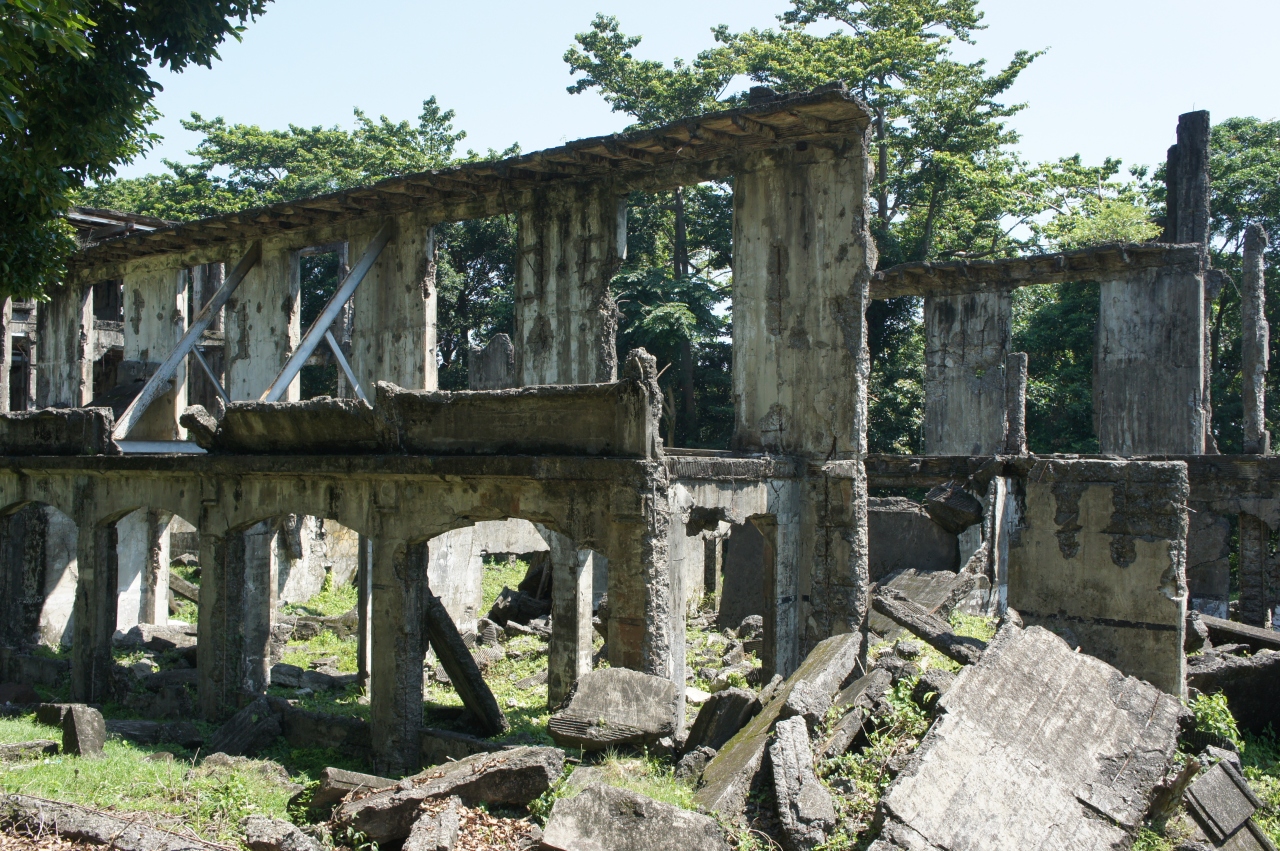 爆撃されて朽ち果てている建物の骨組み、当時の大砲、多くの御霊の慰霊碑。