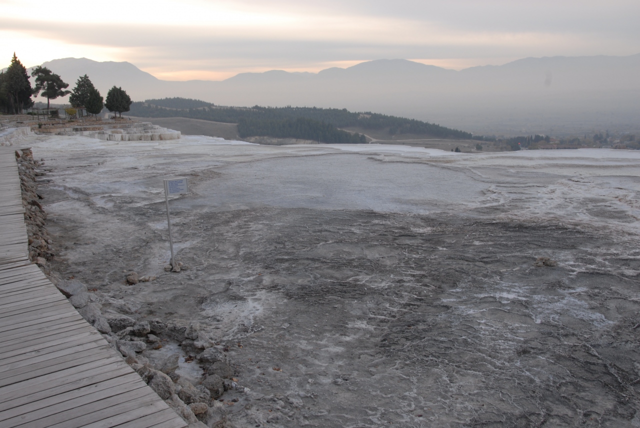 テレビの旅番組でよく紹介されているパムッカレの石灰棚は薄いブルーの色の水がたたえられていて誰もが行ってみたいと思う観光地です。私が行った時間は早朝に近い時間でそれほど観光客はいませんでした。パムッカレの入り口から入ると遠くに古代ローマの遺跡が所々に見えます。朝日が白い石灰棚の上に昇り、ブルーの色は見えなかったですが、その現実離れした光景は素晴らしいの一言に尽きます。
