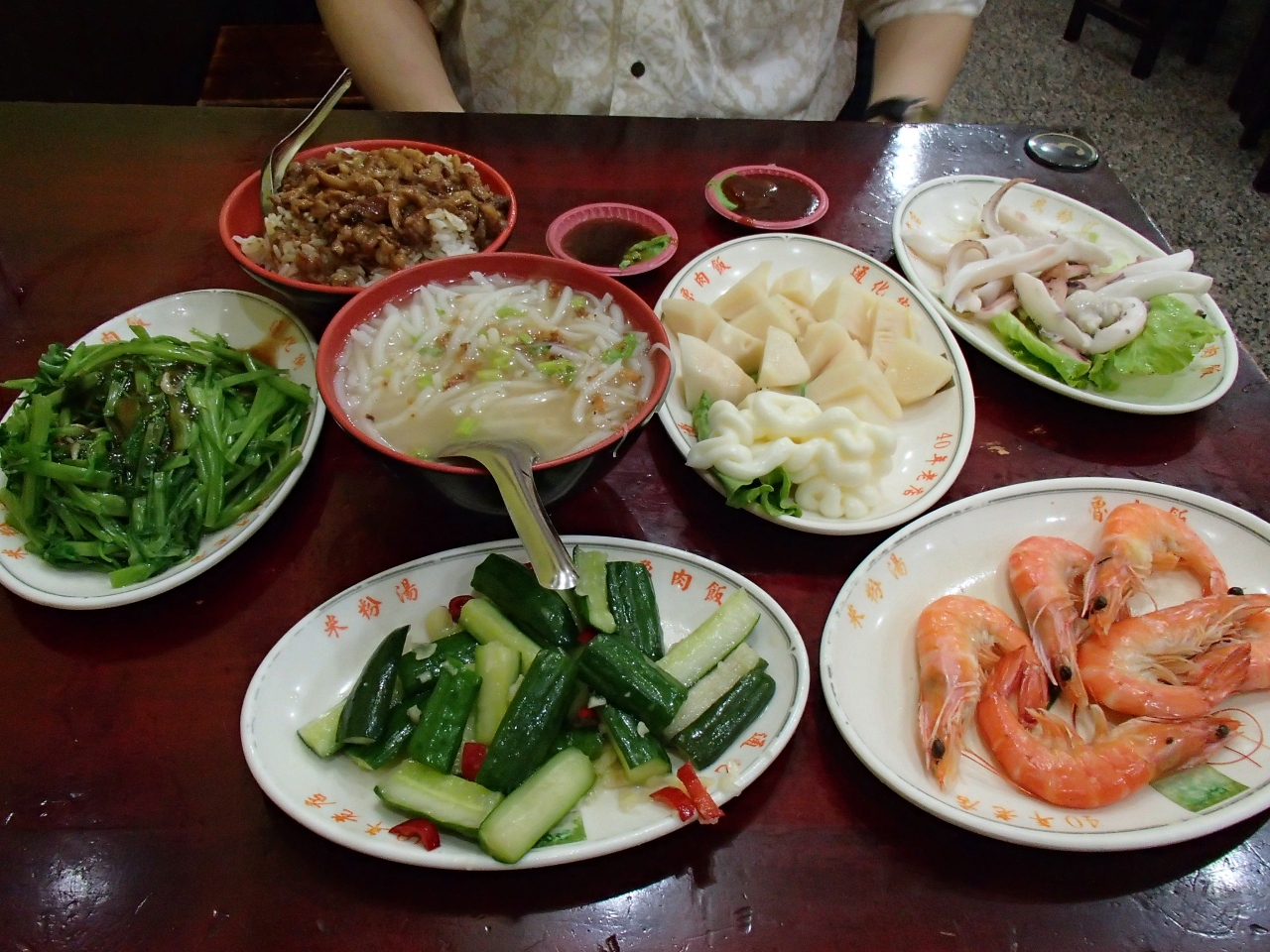 - 米粉湯・魯肉飯は各30元、安い野菜料理各50元、肉・海鮮等料理各100元