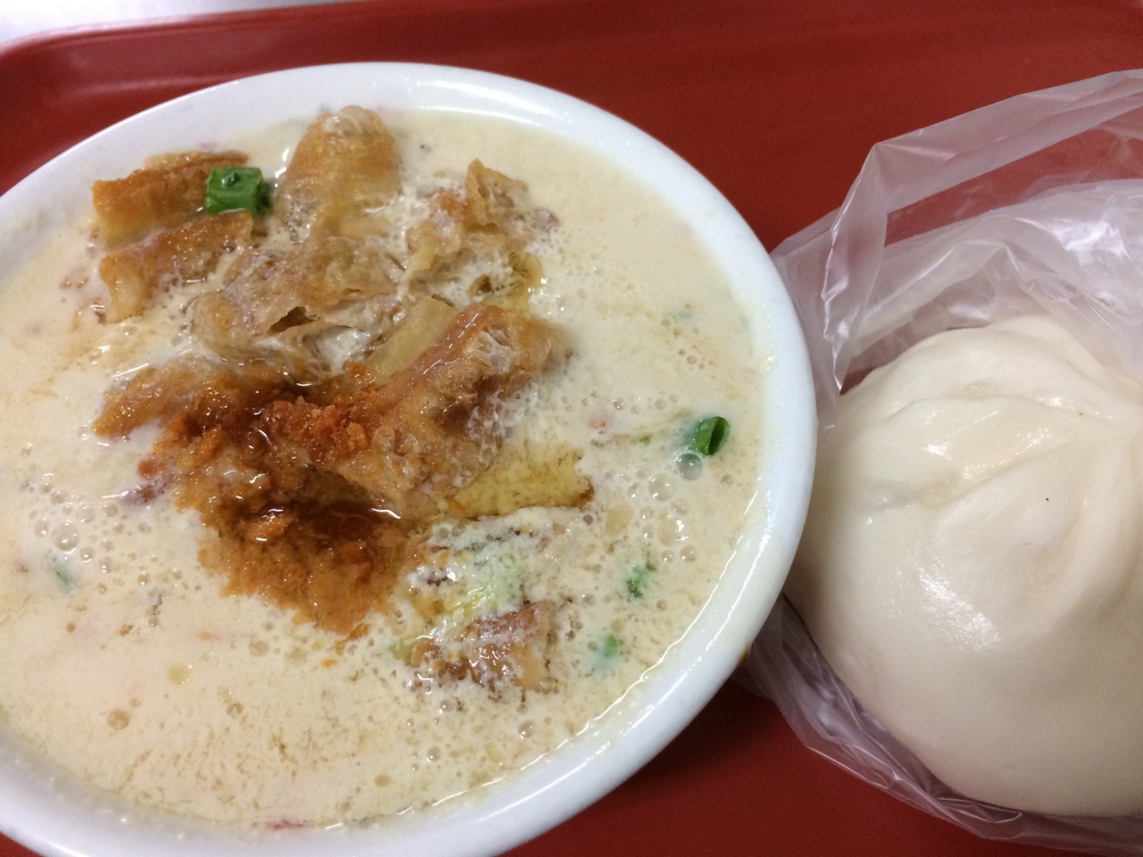 朝から長蛇の列ができており、おぼろ豆腐のスープや揚げパン、オムレツ、蒸しパン、小籠包、肉まん、豆乳等、低コストでおなかいっぱい食べられました。入店時に注文し、支払いを済ませてから着席して待ち、店員が注文した料理を配膳してくれるという流れです。台湾の朝の光景です。