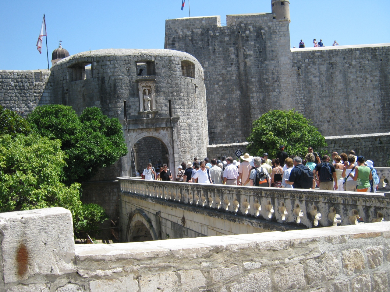 旧市街地の西の出入口のピレ門へ向かう途中にこの石橋があります。石橋の下は旧市街地を守るためなのか結構深い空堀になっていました。石橋の手前で橋とピレ門を背景にするといい写真が撮れると思うので、この石橋の前で立ち止まって見学してみましょう。