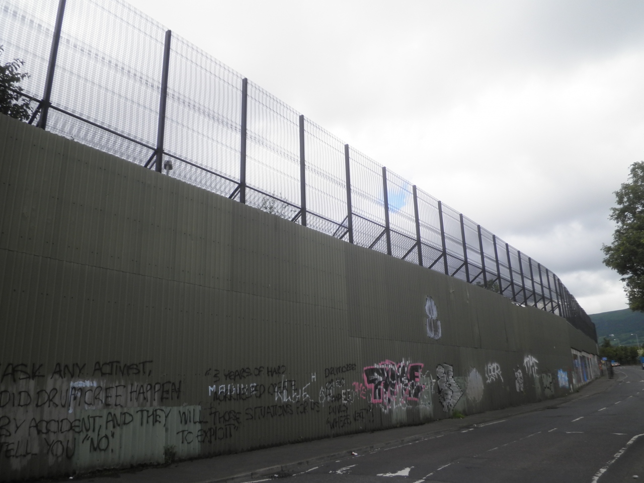 賑やかな町の中心シティホールからカトリック系住民が住むフォールス・ロードの入口まで約15分。その当たりまでは閑静な住宅街ですが、徐々に寂れた雰囲気に変わり、10分ほど歩くと突然、高く長い壁が現れます。