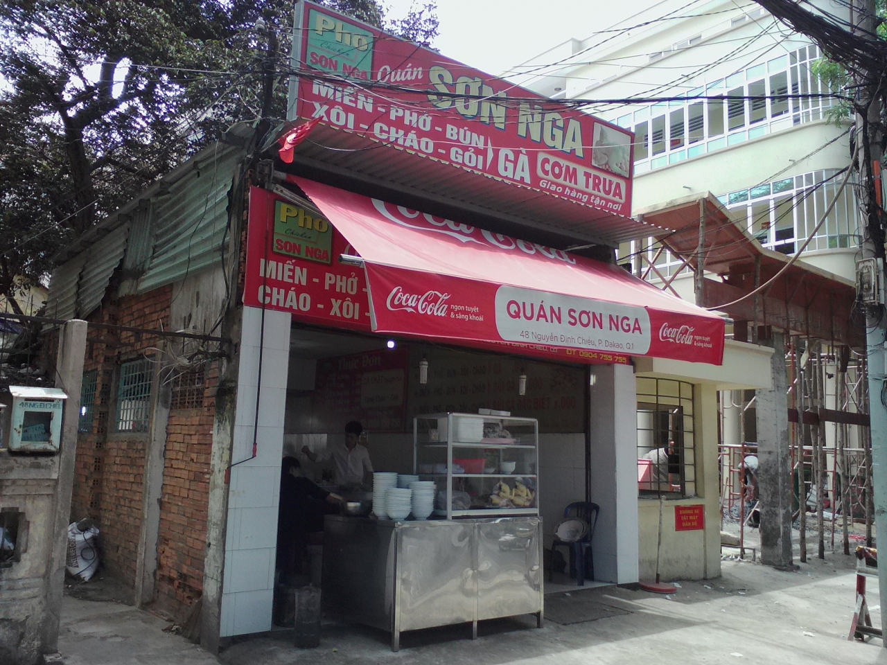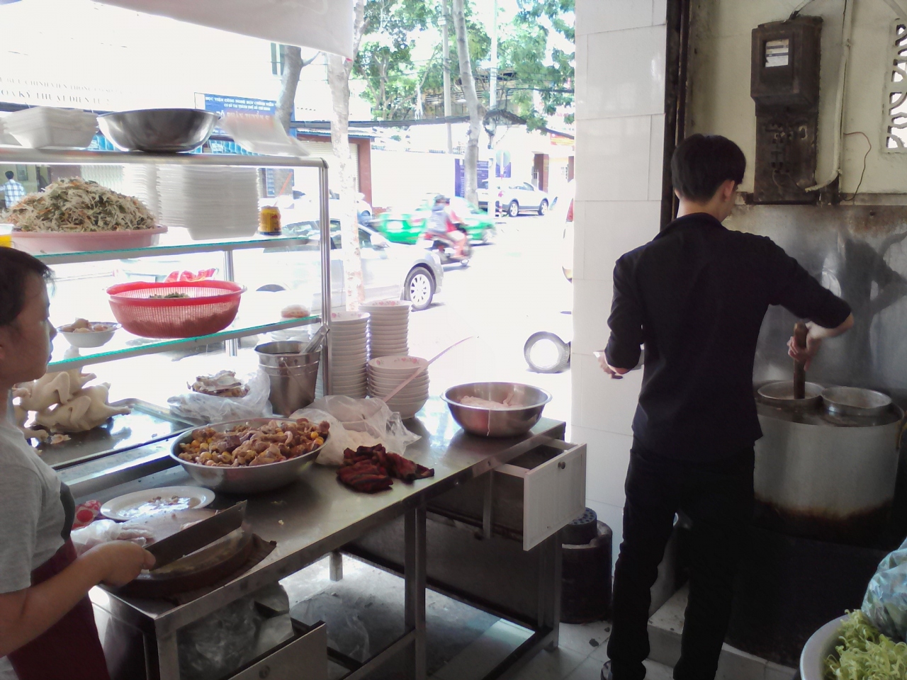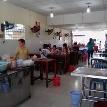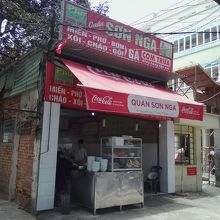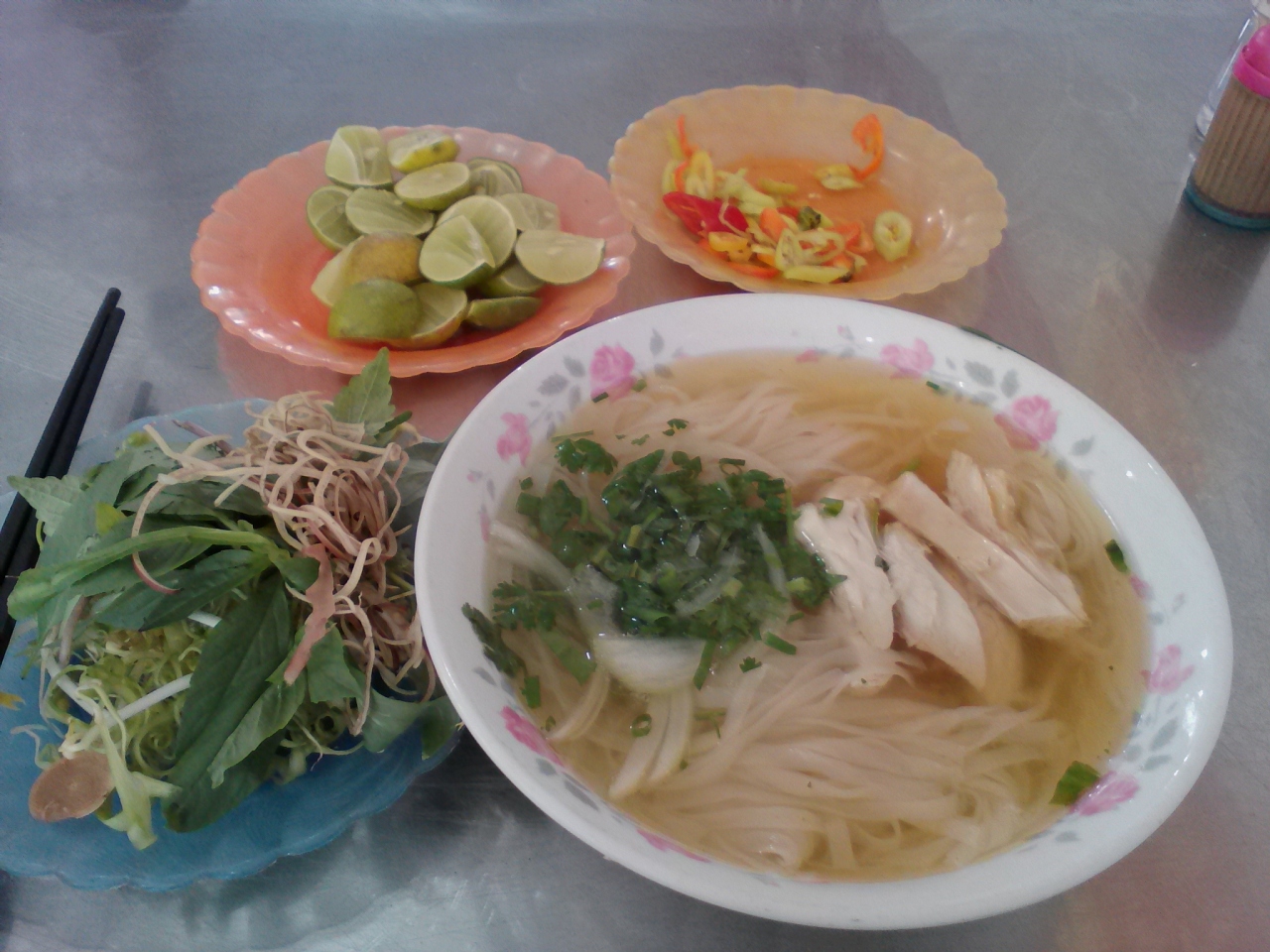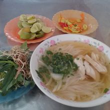 鶏(ガー)専門店。メニューは麺各種(ミェン, フォー, ブン)、ソイ(おこわ)、チャオ(お粥)などがありますがすべて具は鶏肉。牛肉、豚肉はありません。でフォーガーをオーダー。しばらくして香草類を盛った皿と共に運ばれて来ました。具は鶏肉、玉ねぎ、ネギといたってシンプル。スープは澄んで輝いています。あっさり味かと思いきやしっかりとダシが出ていて濃厚。お好みでライムを搾るとよりいっそううまさが引き立ちます。香草は丼に入れて混ぜて食べるように言われたのでそうしましたがう~ん…。せっかくのダシが薄まってしまったように感じたのであまりおすすめしません。鶏肉には特に味付けがされてないのでちょっと淡白、唐辛子しょう油に付けて食べてもいいかなと思います。これで一杯3万ドン。なかなかお得な値段だと思います。満足いく一杯でした。