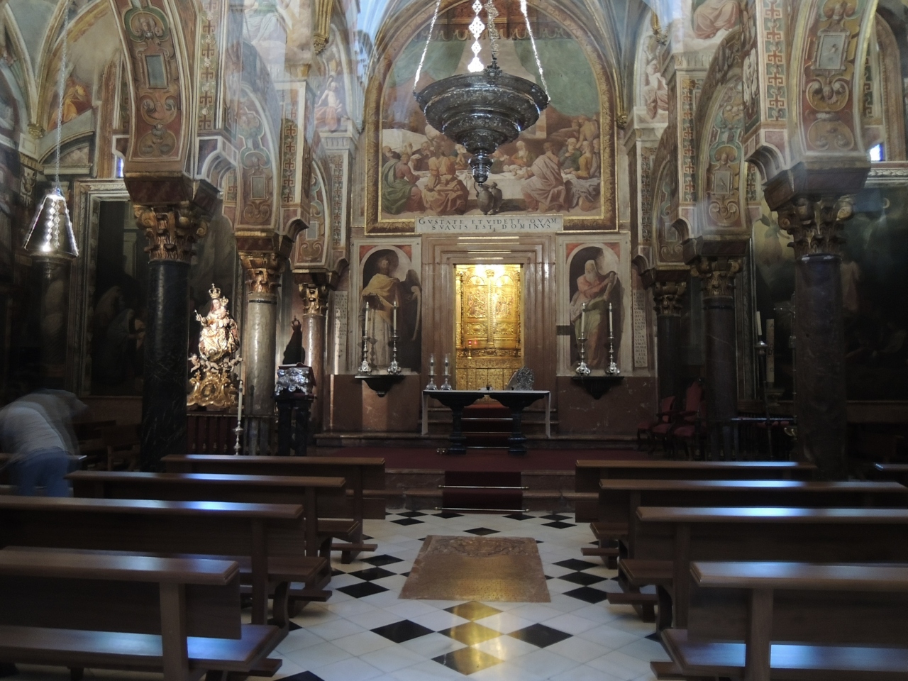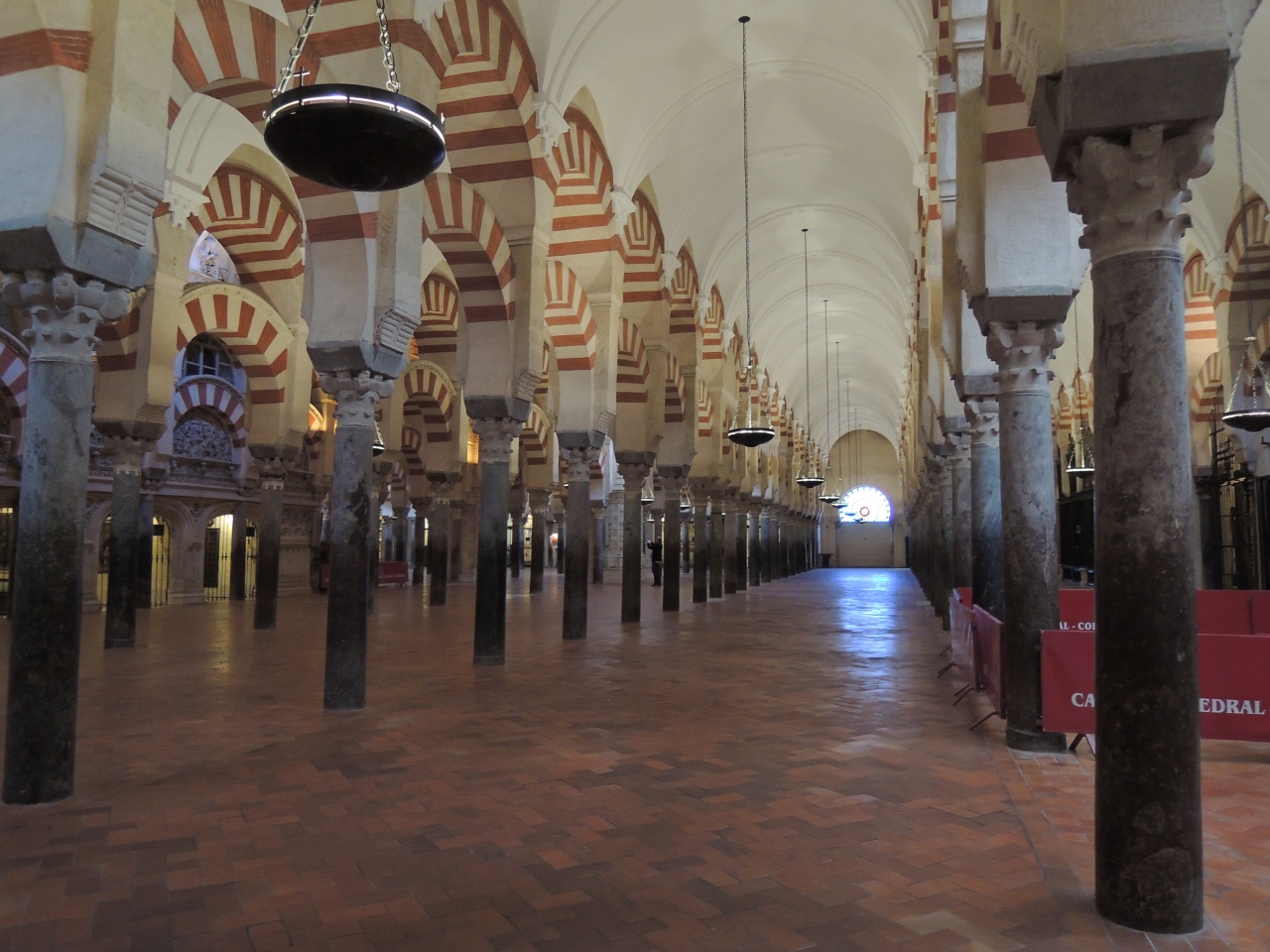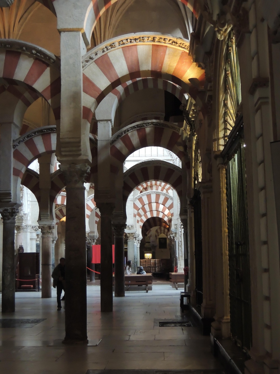 教会のある広場の中に高い塔が建っています。この塔を左に見ながらメスキータの内部に入ります。まず、度肝を抜かれるのは百本位は立っている柱の多さです。柱の上部分がイスラム風の赤色と白色の帯になっています。さらに、奥の方へ行くとキリスト教の礼拝堂が3カ所ほどあります。ここで長椅子に座っていると何となく心が落ち着いてきます。