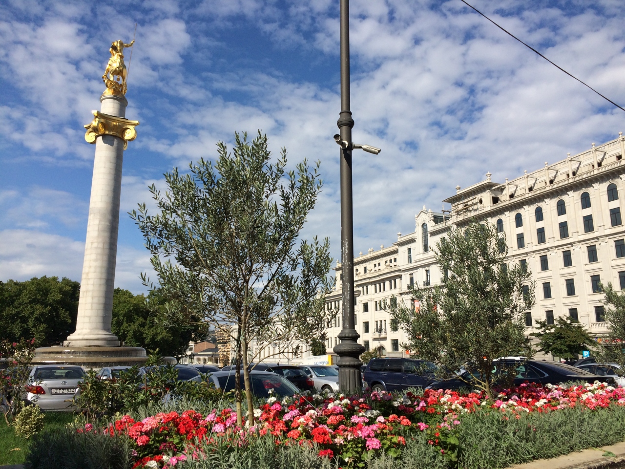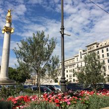 トビリシの新市街に位置しており、金色の像を冠した塔やレリーフの美しい西洋建築が並び、同じコーカサスで隣国のバクー等の町とは明らかに異なり、ヨーロッパ色の強い景観です。プーシキン広場に面し、銀行や高級ホテル、品の良いレストランやショップが立ち並ぶエリアです。