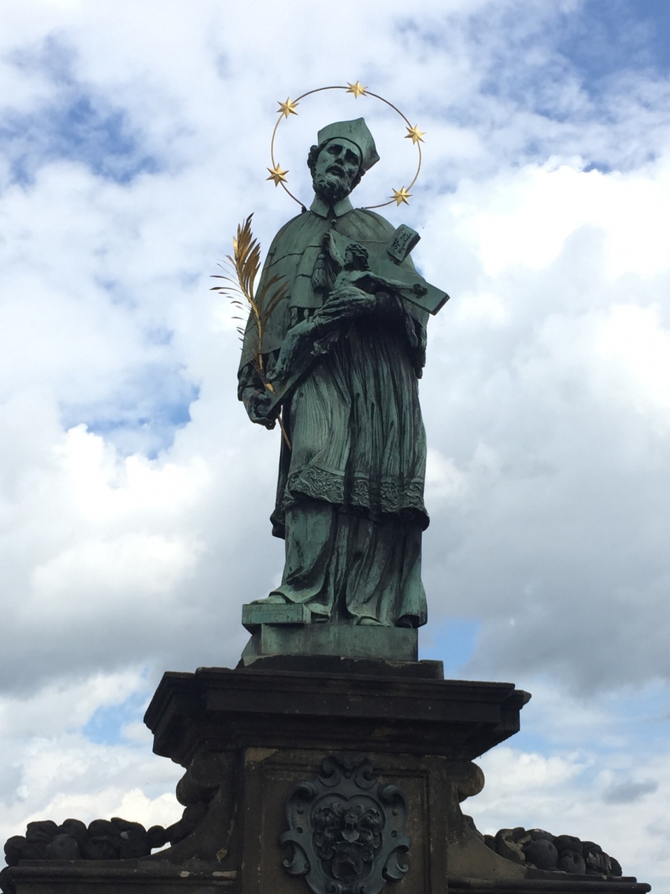 橋の左右に絵やアクセサリーを売るお店があり、それらや左右の聖人に目を取られているとスリに遭う機会が多いので気をつけて下さい。真ん中から やや小地区よりのヤン ネポムツキーの像のネポムツキーを左手で触りながらお祈りをすると願いが叶うそうです。その左側の犬は安産祈願だそうです