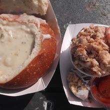 カップ入りのエビとカニのコンボとブレッドにクラムチャウダーを買って19ドル。