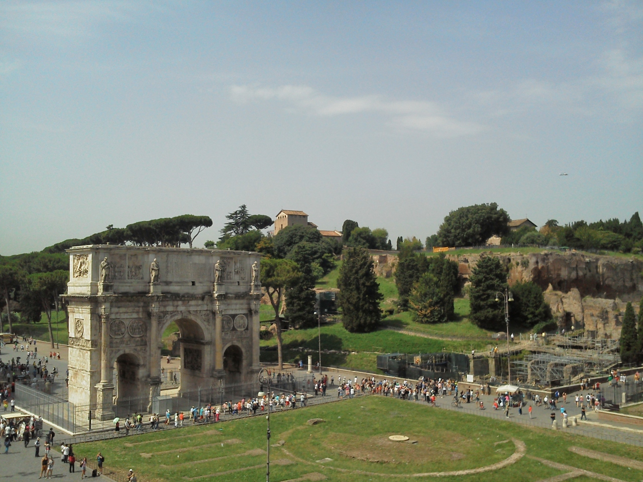 ローマに来たのは第一はコロッセオを観るために。 早速、市内バスに乗って行くとコロッセオの姿が窓から段々と,,。 で、バス停を降りたら[凱旋門]が有ったのにビックリ?(当然コロッセオもですが、) あわててガイド帳を見たら「コンスタンティヌスの凱旋門」が(^^!) ローマの歴史に関心し、改めて`遺跡`を残したローマ人に感謝感激! (コロッセオを見た後 フォロ・ロマーノに行くのに、もう一つの[凱旋門]が有ったのには更にビックリ。「ティトゥス帝の凱旋門」でしたョ!)