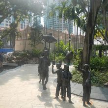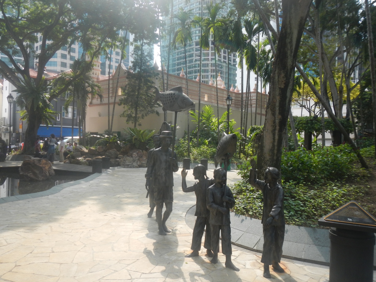 街歩きをして疲れた時に一休みした。テロック・アイヤー・ストリートに面した小さな公園だ。昔の人々、(と言っても150年ぐらい前かな)魚を棒にに刺して運んでいるなどの生活の様子を再現した像がユーモラスだ。