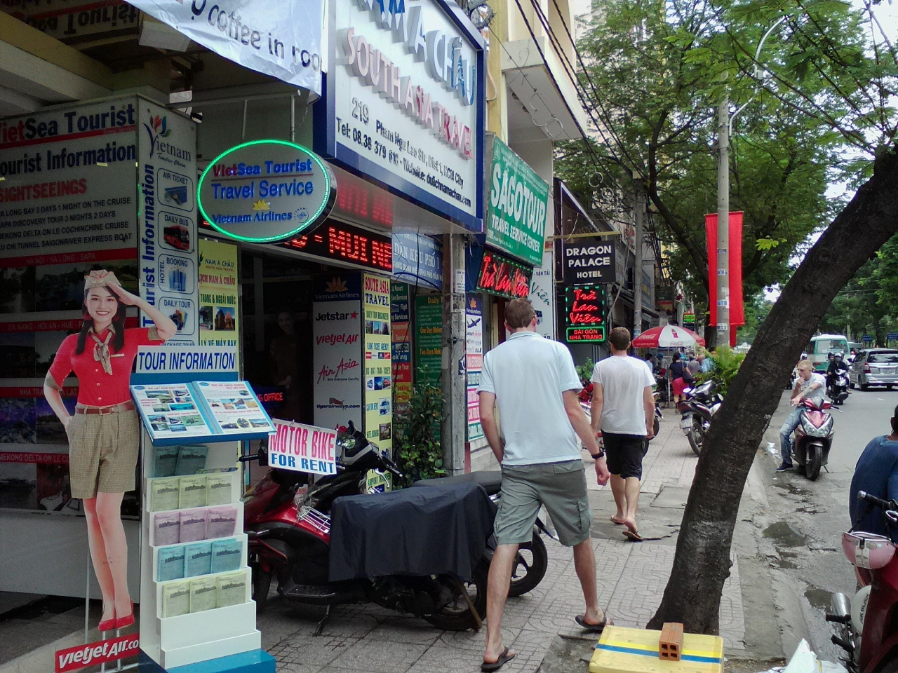 ベンタイン市場前のロータリーから南西方向に広がる9月23日公園の南側を走る通り。安宿街の中心デタム通りとも交差しているため“デタムエリア”と言えます。外国人旅行者の姿も多いです。通り沿いにはホテルやコンビニ、マッサージ屋などに混じり一番目立つのが旅行会社やバス会社。呼び込みも盛んです。バスチケットの値段を比較するのも手間がかかりません。