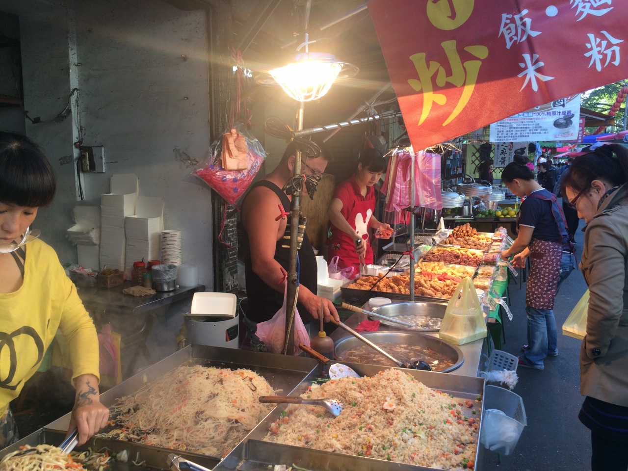 地下鉄雙連駅から歩いて数分のところで道なりに朝市が立ち、店が並んでいます。差かやな肉、野菜や果物を売る店、その他ビーフンを焼いている屋台など、朝からエネルギッシュな市場でした。朝食に焼きビーフンをいただきましたが、新竹産でコシがあっておいしかったです。