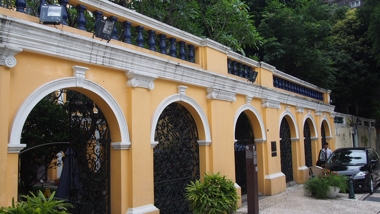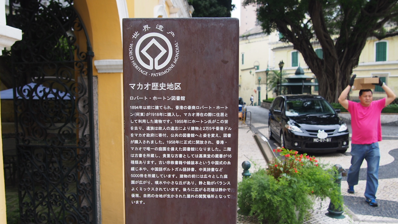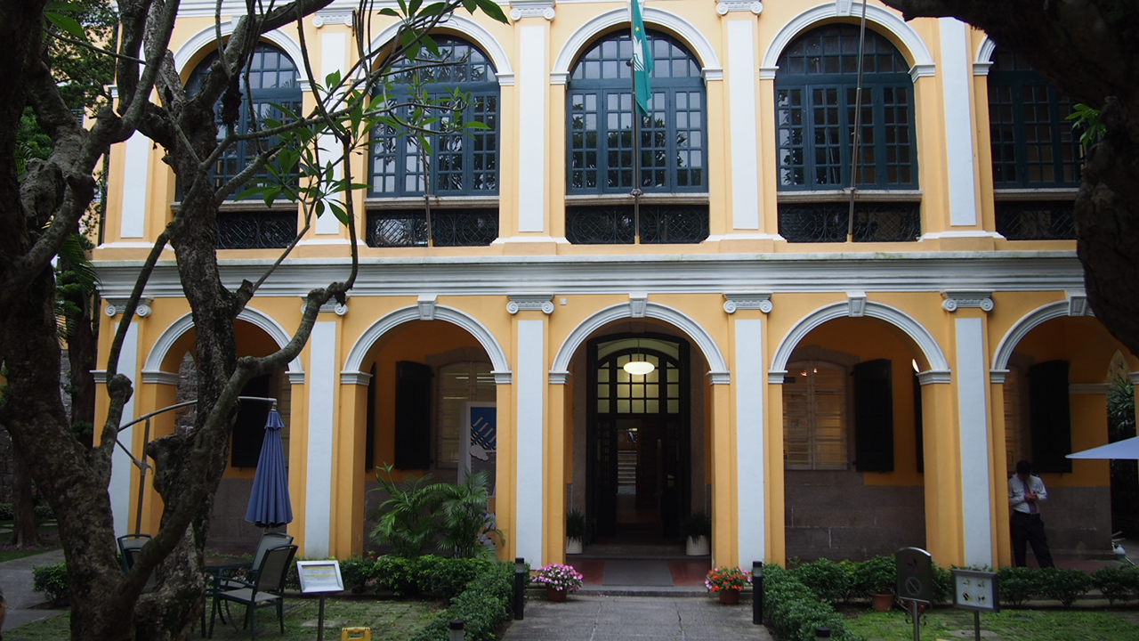 クリーム色と白色の外壁があり、庭を抜けると本館の図書館があります。