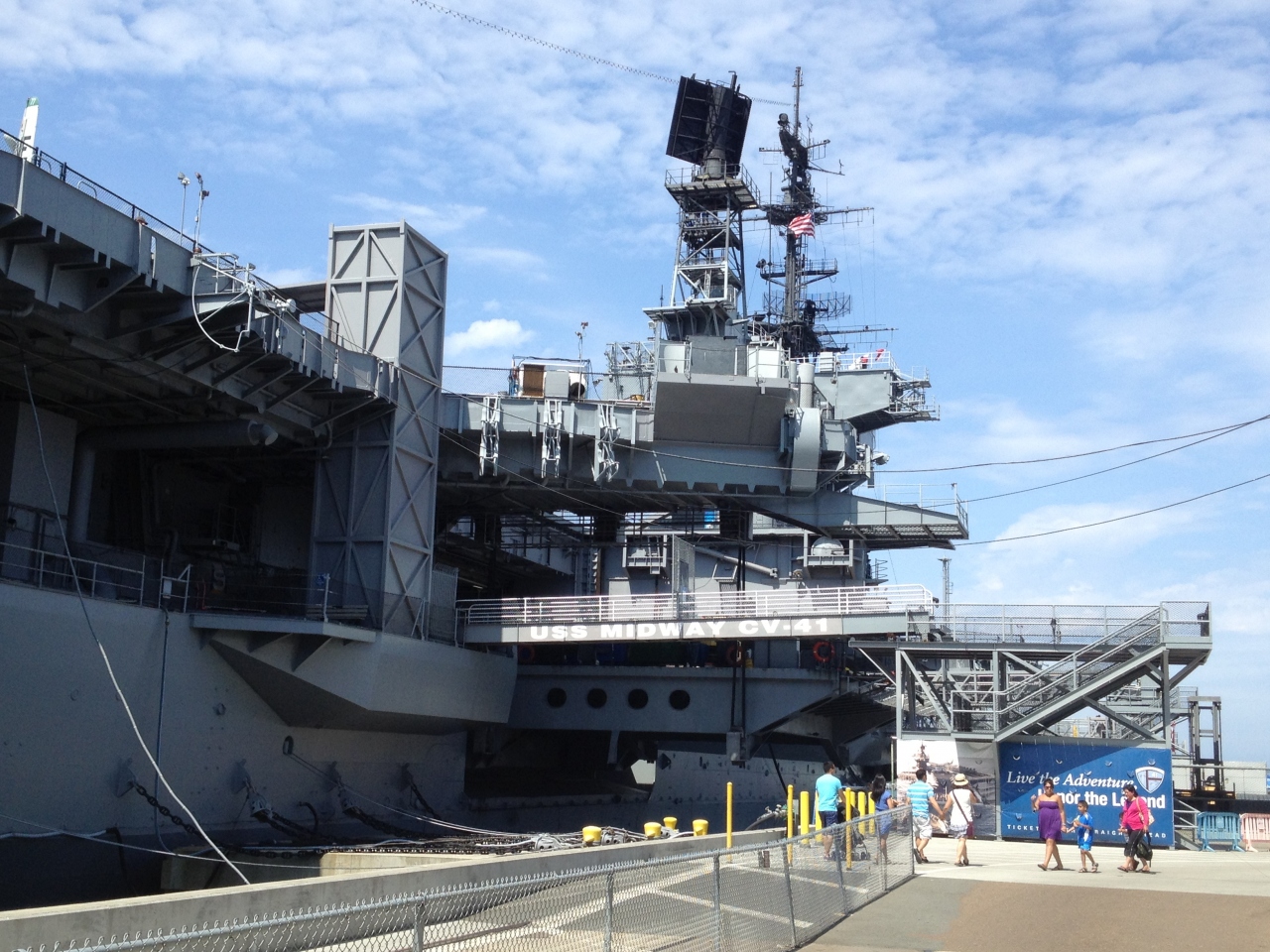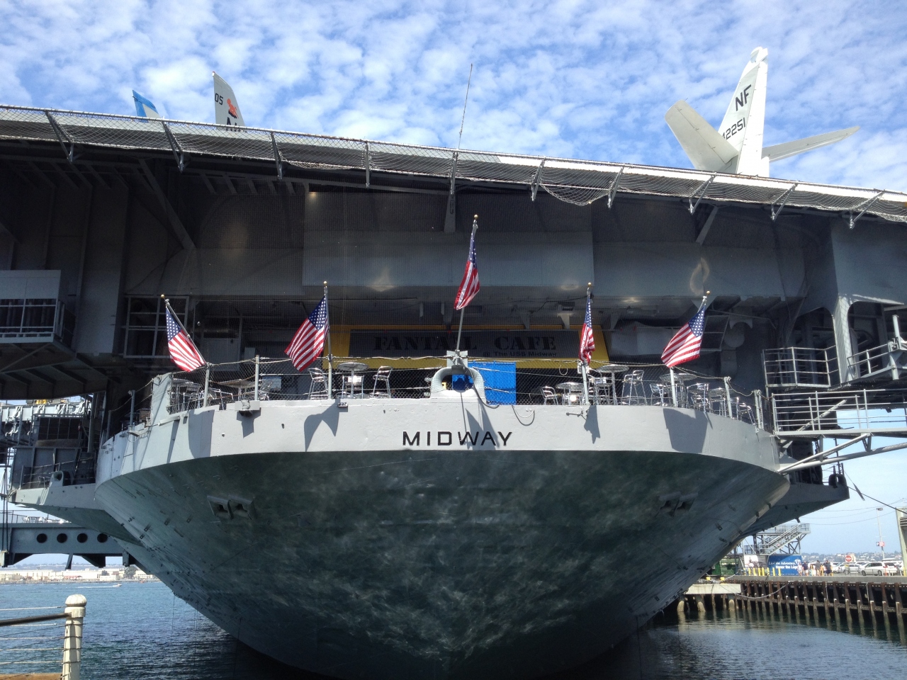 1945年9月10日に就航し、1997年3月に引退した米軍の航空母艦であり、ベトナム戦争や日本部隊への配属、湾岸戦争でのペルシャ海展開等、歴史的な紛争に搭乗したことで有名です。2004年にサンディエゴ港海軍埠頭に係留され、博物館としてオープンしました。軍艦などに興味がなくても、その大きさを真にあたりにすると驚きますし、乗船して施設を見て回ると少しなりともミッドウェイの歩んだ歴史を感じることができると思います。