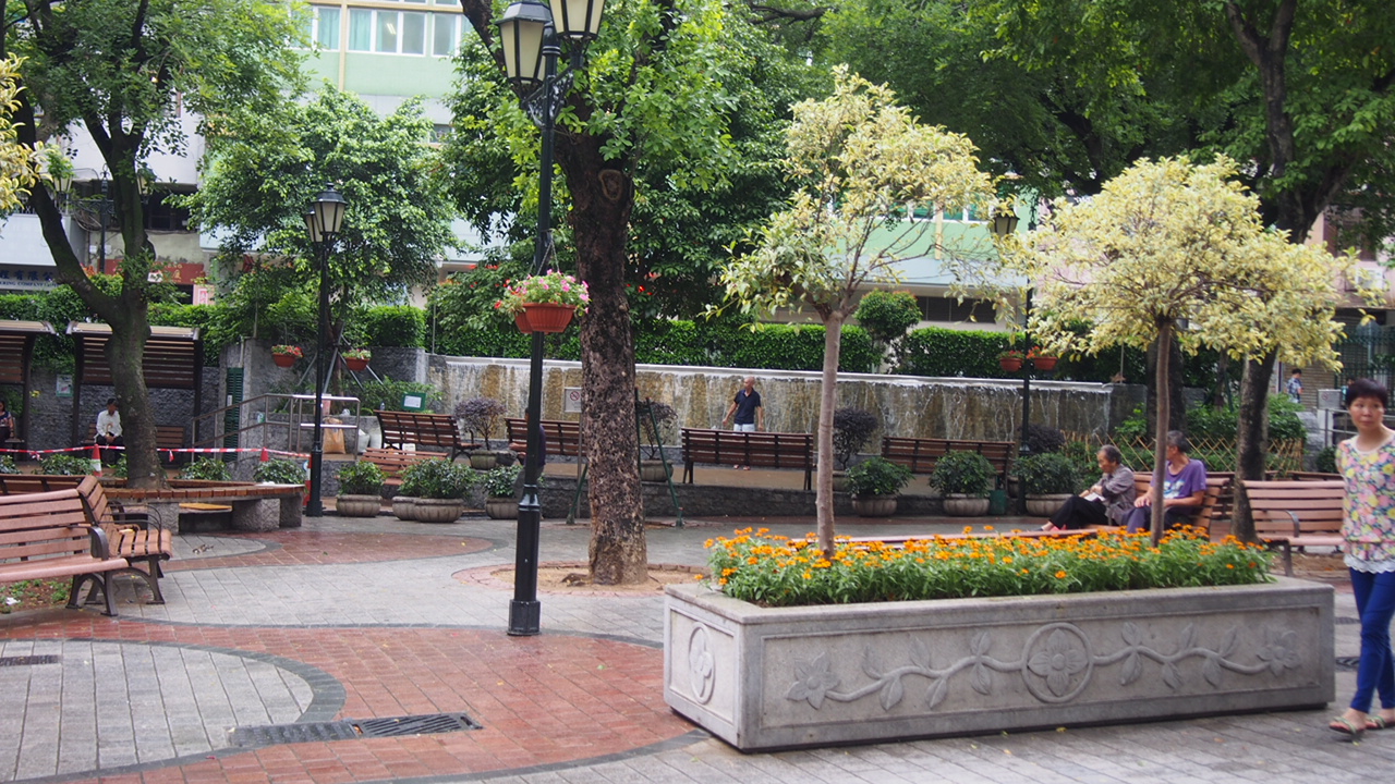 年配の方たちが、散歩をしていたり、雑談をしていたり、ゲームを楽しんでいたりと思い思いに寛いでいます。
