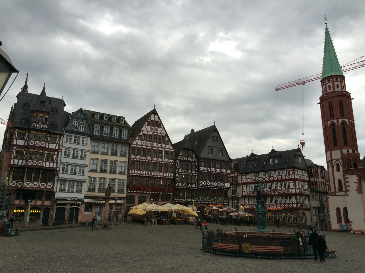 フランクフルト中央駅からUバーンで2駅の距離でした。もう間もなくクリスマスマーケットが始まろうかという晩秋のころで、夕方でちょうど雨が降っていたためか、少々寂しい印象を受けました。経済の町のフランクフルトにある小さくてかわいい広場でした。