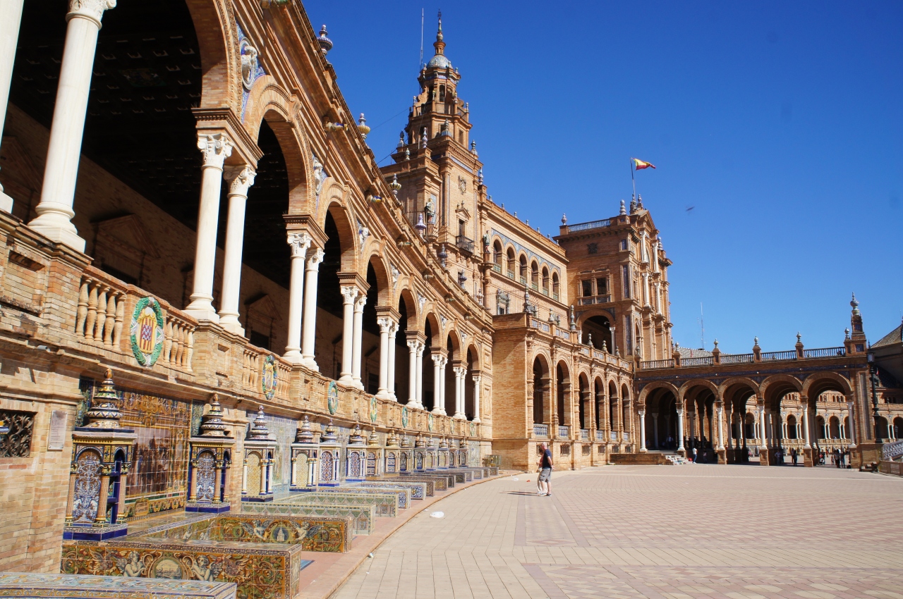 イベロ・アメリカ博覧会の会場として造られた綺麗な広場です。両端に塔のある美しい半円形の建物はとても優雅な雰囲気で、水路を渡る陶器製の橋や、スペイン各都市にまつわる物語がタイルに描かれたベンチも素敵でした。大勢の人が訪れる観光スポットになっています。