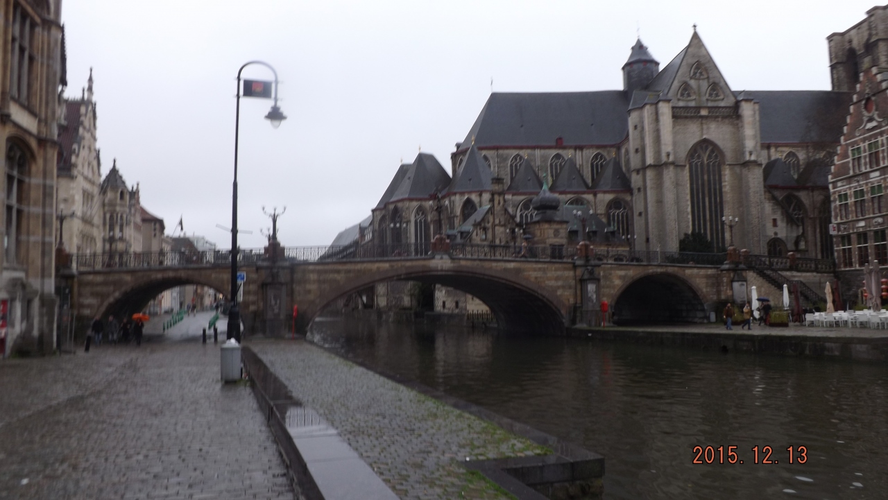 聖ミヒエル橋の上で、まじかに見た時にはそんなに気になりませんでしたが、レイエ川の川岸から遠目で見ると、やはり塔が中途半端な感じで違和感を感じます。しかし、レイエ川と聖ミヒエル橋と聖ミカエル教会は一幅の絵になっています。