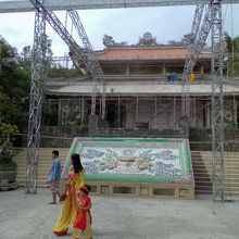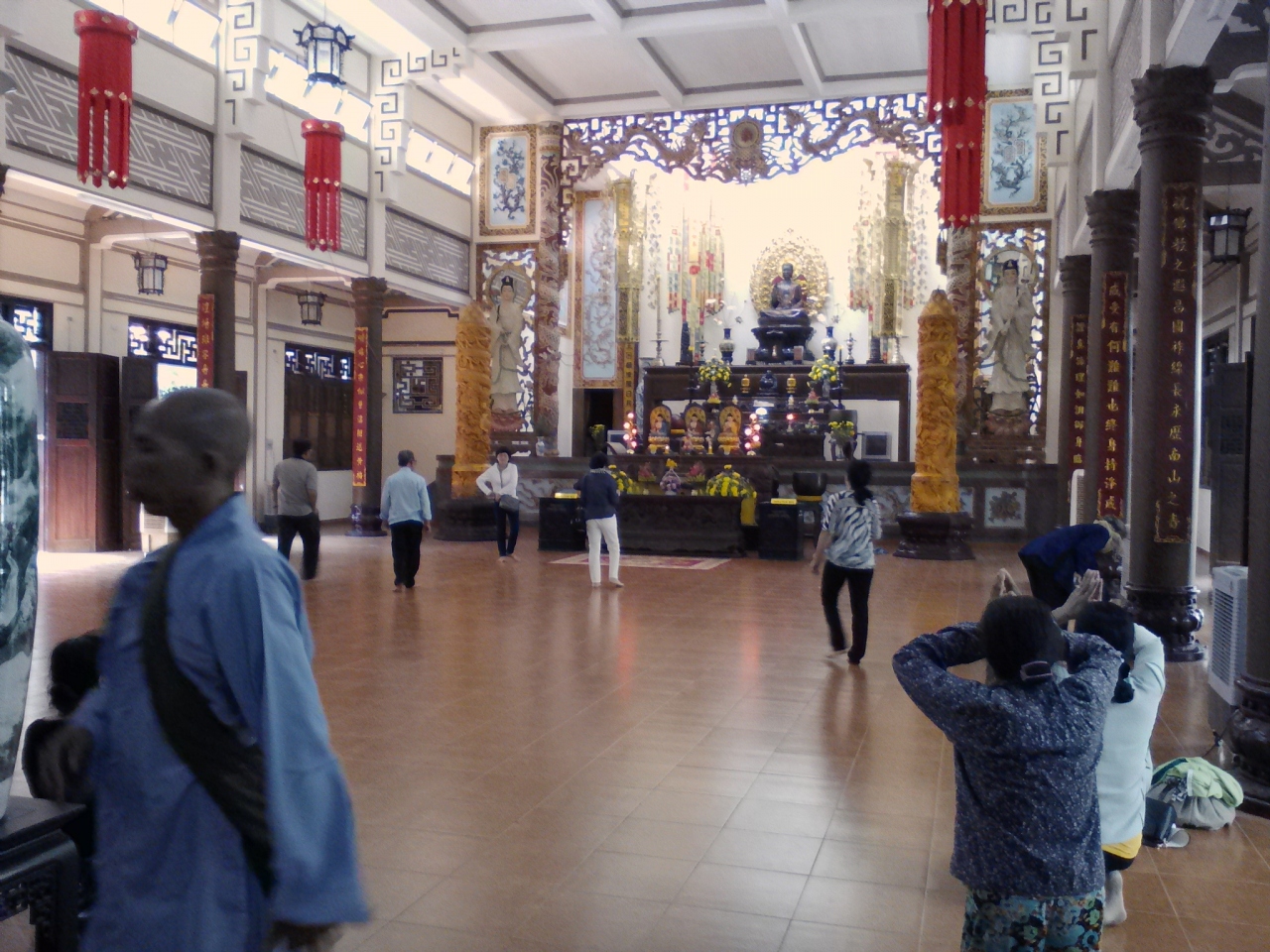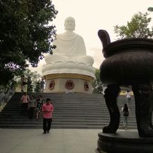 このお寺もツアー客の観光スポットに組み込まれているようで入り口付近はバス待ちの人を含めてかなりの人口密度です。なんと本殿は工事中と思ったら正面部分の改装だけで本堂には横側から入れました。内部は広く仏陀の座像が安置されており地元の方が熱心にお祈りしていました。本堂の先、階段を上がって行くと途中に涅槃像、山の上に大きな白い仏像があります。眺めもよくニャチャンの町が望めます。海もちらっと見えます。大した高さの山ではありませんがちゃんと道路がありバイクや車でも行けます。