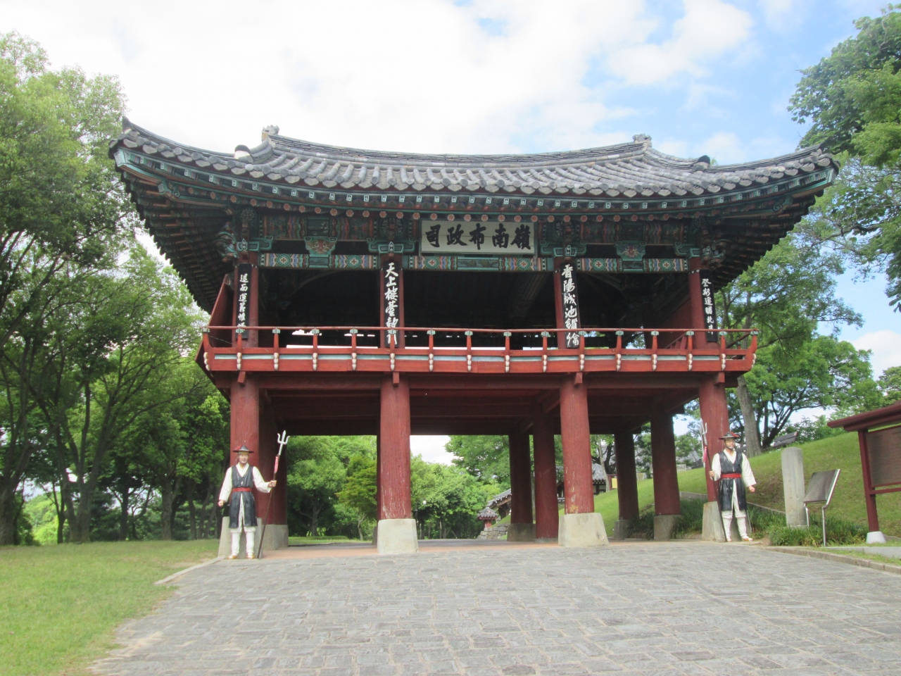 晋州市街の南河沿いにある城跡で晋州の歴史と文化を代表する観光地、1592年の壬辰倭乱(文禄・慶長の役)で金時敏将軍が3800人余りの少ない軍勢で約2万人の日本軍を撃退した3大戦勝地の一つになっています、現在は城跡に多くの史跡が残されていますので散策しながら見ることが出来ます、又、晋州博物館があり無料で入館できます。