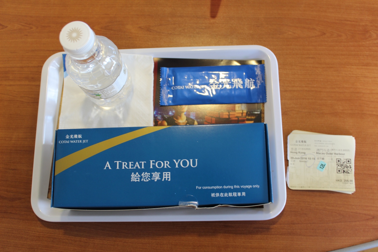 帰りは『Cotai Class』を利用。『Cotai First』のような快適感はないですが、1時間の船旅、特に問題ないです。飲み物は有料でした。