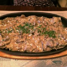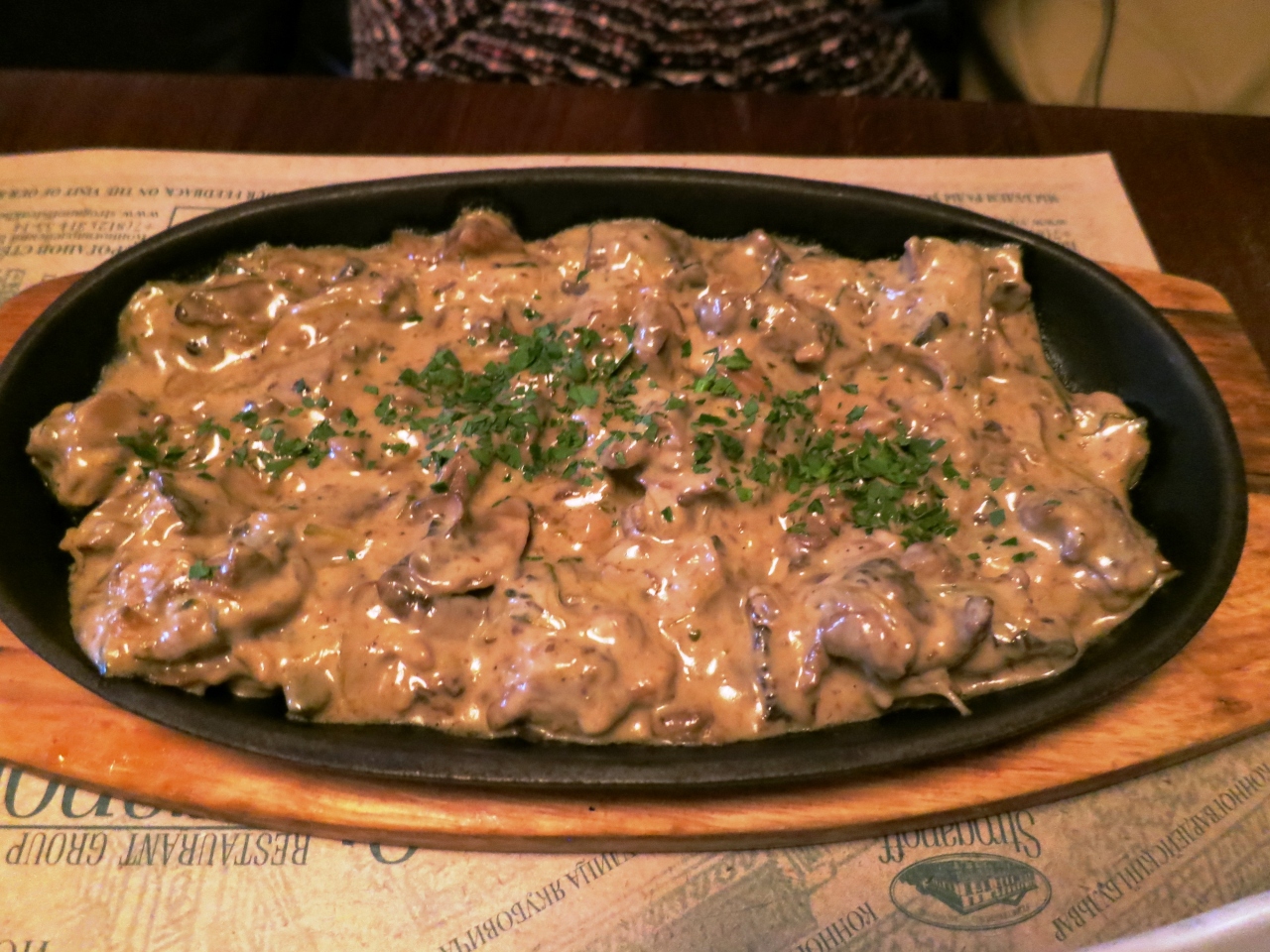 注文したのは、ステーキ、ビーフストロガノフ、黒パンです。