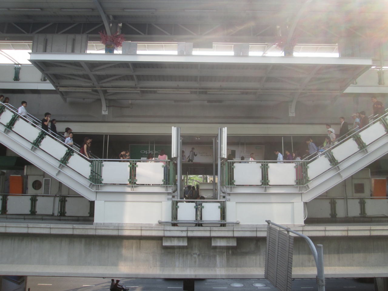 地上にある高架の駅です。改札口から駅ホームまではエスカレーターか階段を利用しますが、階段は転落防止用の手すりの位置が低い部分があります。タイ人は抵抗なく利用していますが、階段を上り下りする場合、階段の内側を歩くなど注意が必要です。