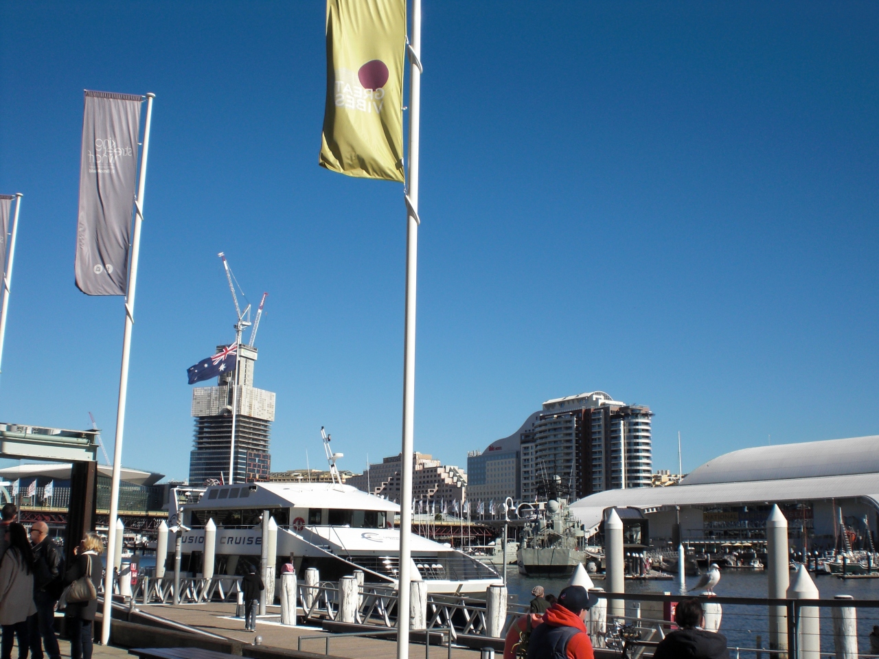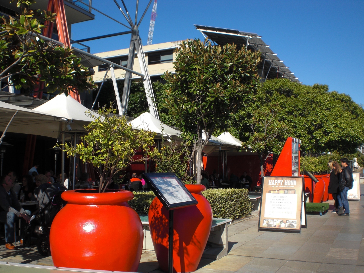 お台場はここをモデルに造られたとの事で、ランチ、ディナークルーズの船が並ぶマリナー沿いに、オープンテラスのレストランがたくさん有り、お洒落な雰囲気です。昼食を終え、レストランを出ると、ちょうど青空にプロポーズの言葉を、セスナで描いている途中で、見ているこちらまで幸せな気持ちになりました。