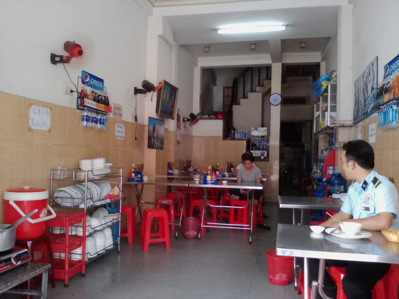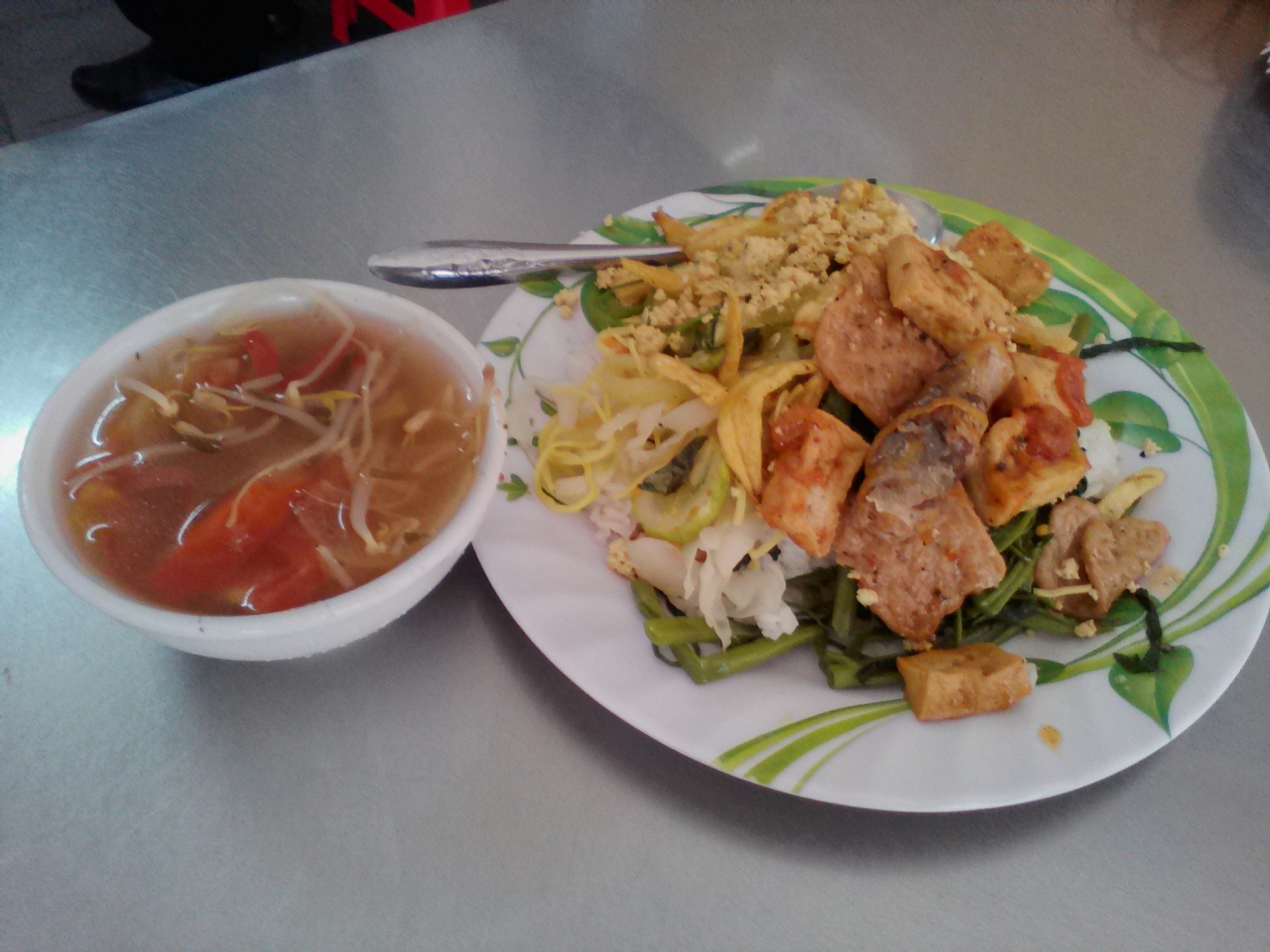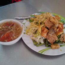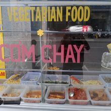コムチャイと呼ばれるベジタリアンフードのレストランです。店の前のガラスケースにはおかずの入ったバットが並んでいます。気に入ったおかずがあれば指させばよし。おまかせでもOKです。ご飯におかず盛り盛り、スープがついて1皿15000ドン。他の町でも何回かコムチャイを食べましたがこの店は値段、内容とにかなりの優良店です。欧米人旅行者も時々食べに来ています。ご飯以外にもフォー、ブン、ミーなどの麺も食べられます。