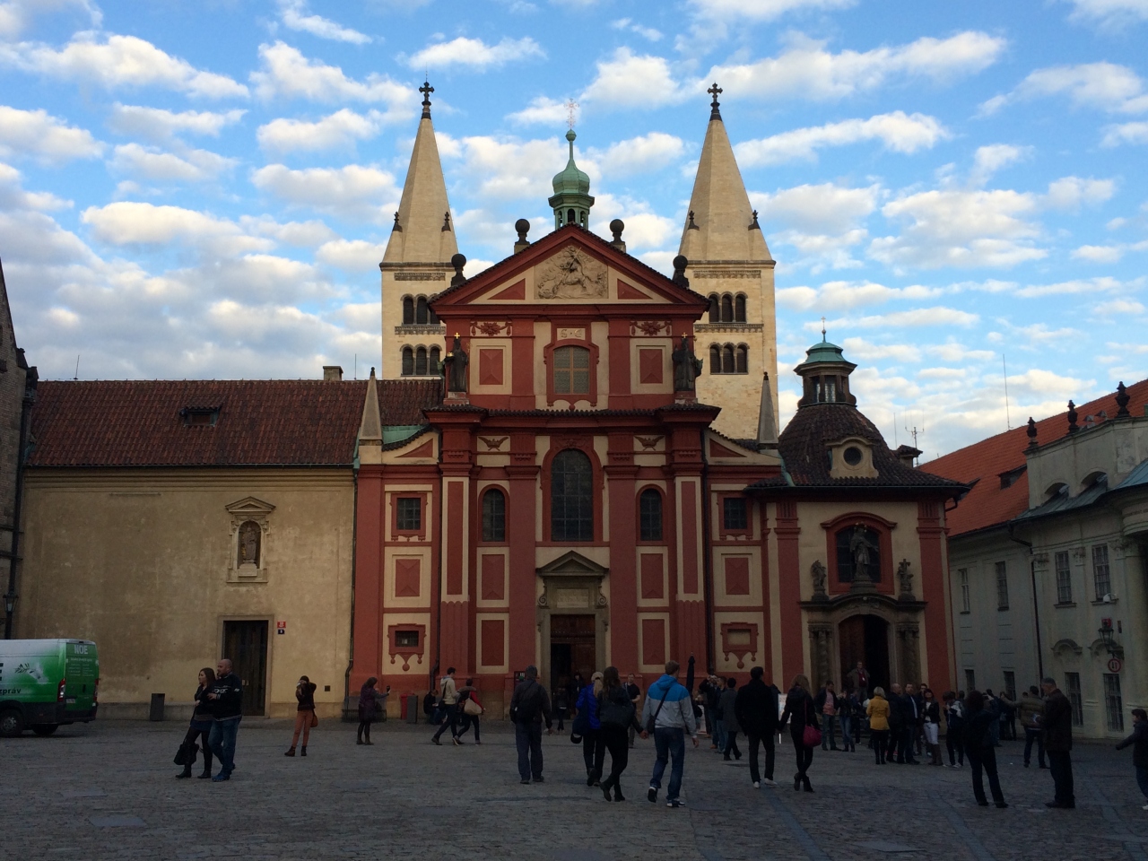 初期のプラハ城が建造された時期に建てられた教会で、920年竣工とのことです。外観は簡素なロマネスク様式ですが、内壁には12世紀以降に描かれたフレスコ画が残されており、レトロな曲線階段が印象的でした。プラハ城と同じ古さを誇る教会ではありますが、見ごたえの点では同じ城内のゴシック様式の聖ヴィート大聖堂の方が関心がありました。