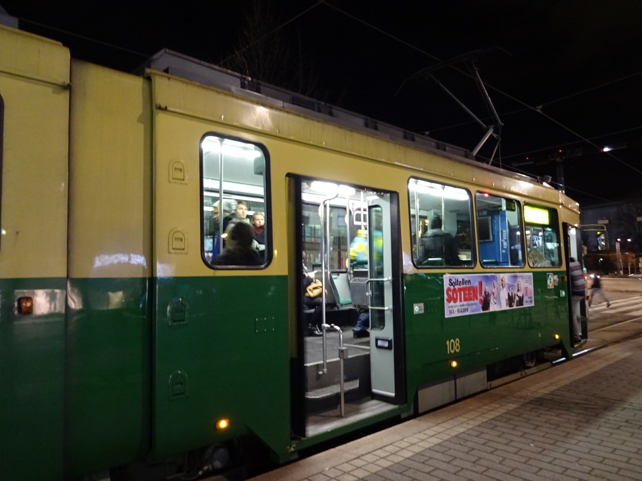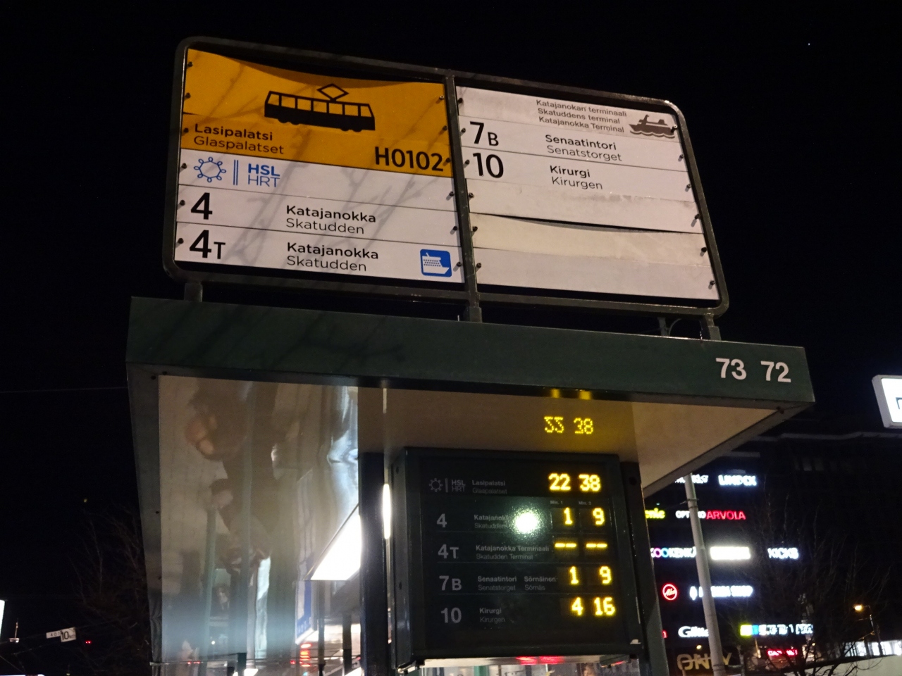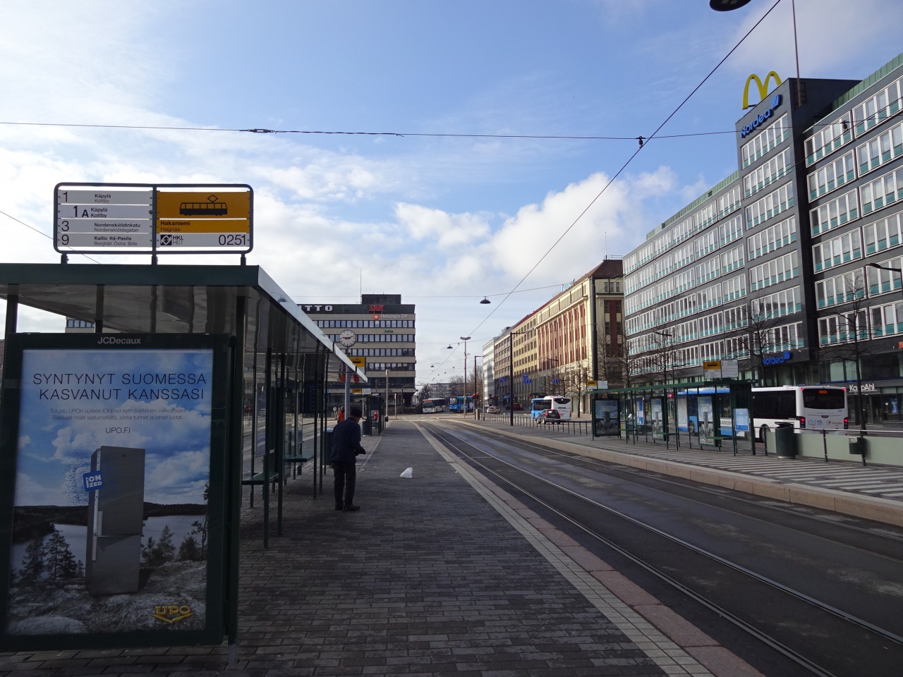 一度、ハカニエミ地下鉄駅前から9番トラムに乗ってランシターミナルへ行こうとしたら、途中の中央駅前で長いこと停車した後に、アナウンスが入って乗客が全員降ろされたことがありました。念のため、時間に余裕を持って移動しましょう。