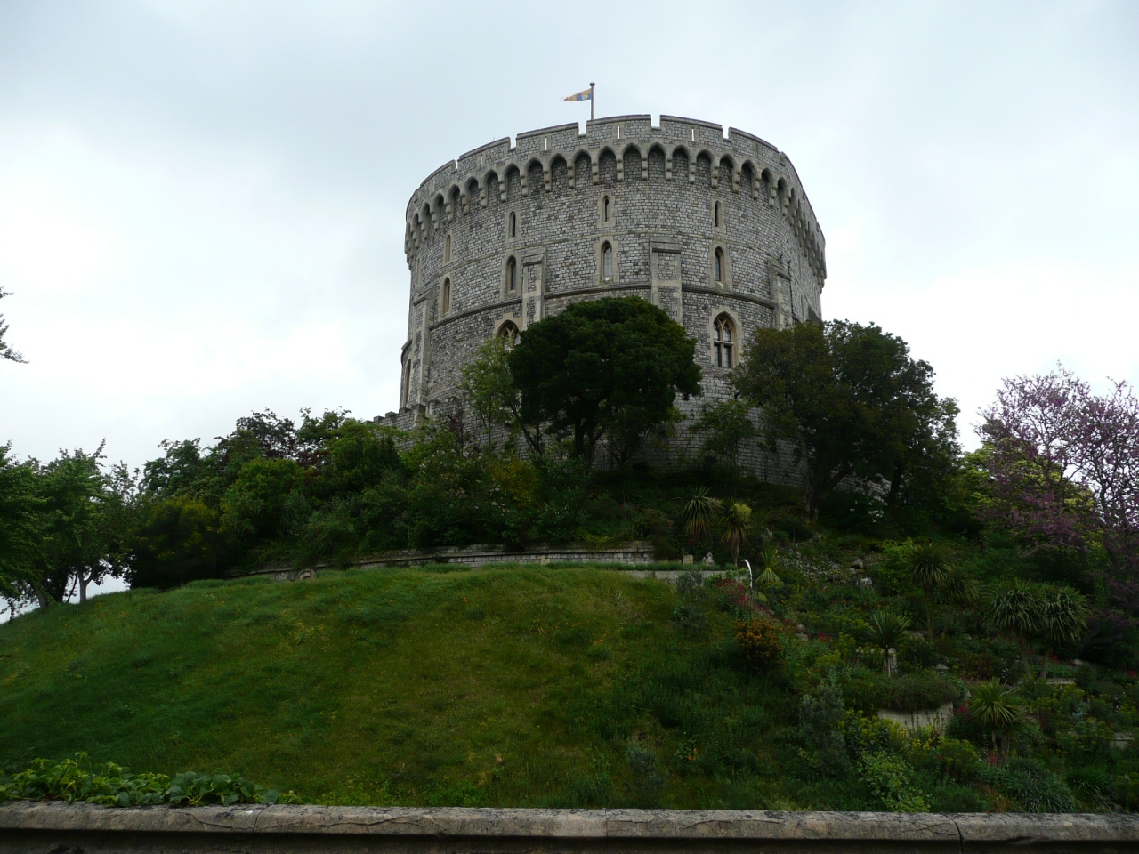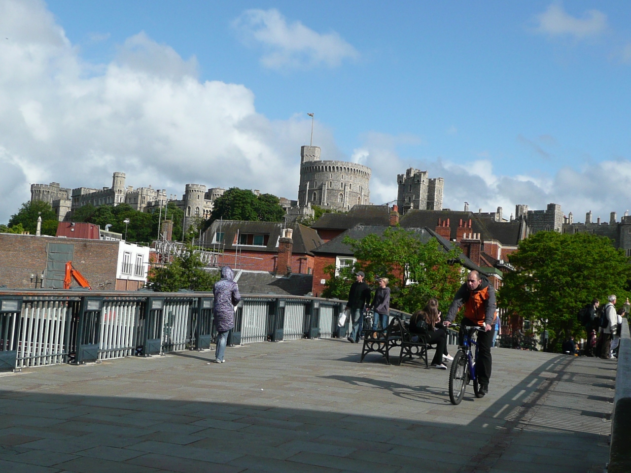 ロンドンのウォータールー駅から直行便の列車で約 1 時間の距離で、テムズ河のほとりに位置しています。列車を降りて、テムズ河の反対側にある丘の上にこのお城が堂々たる景観を見せています。