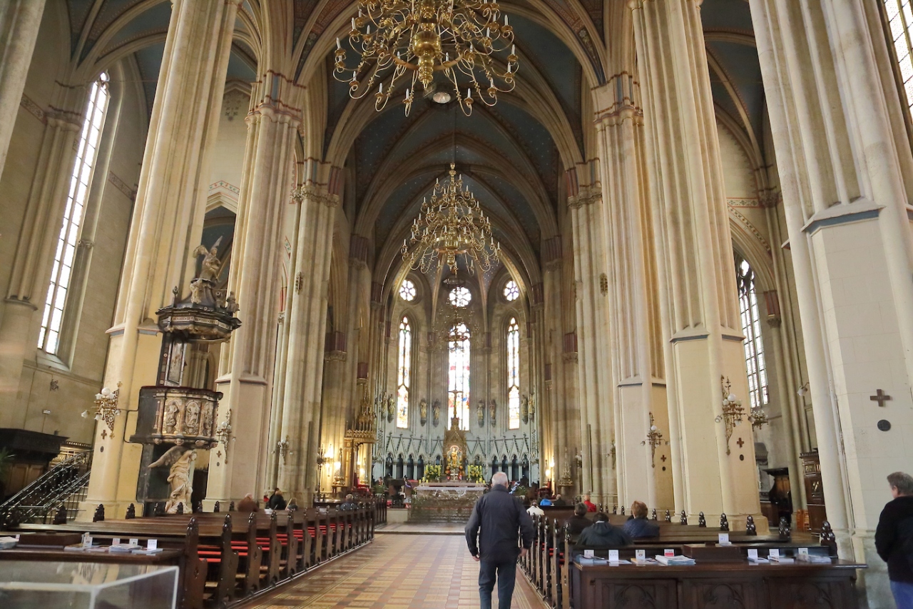 中は大聖堂にふさわしく、立派なものです。リュブリャナの聖ニコライ大聖堂やウィーンのシュテファン大聖堂ほど派手ではありませんが、重厚な雰囲気です。左右壁面の礼拝壇も立派なものですし、翼壇の彫刻は素晴らしいです。祭壇は簡素ですが、奥のステンドグラスは大変に立派なものです。パイプオルガンも大きなものが設置されています。ランドマーク的な存在でもありますので、ザグレブに行くなら訪ねてみることをお勧めします。