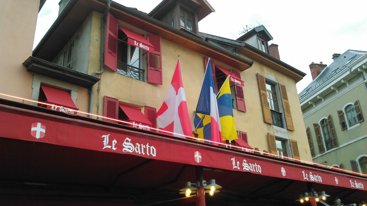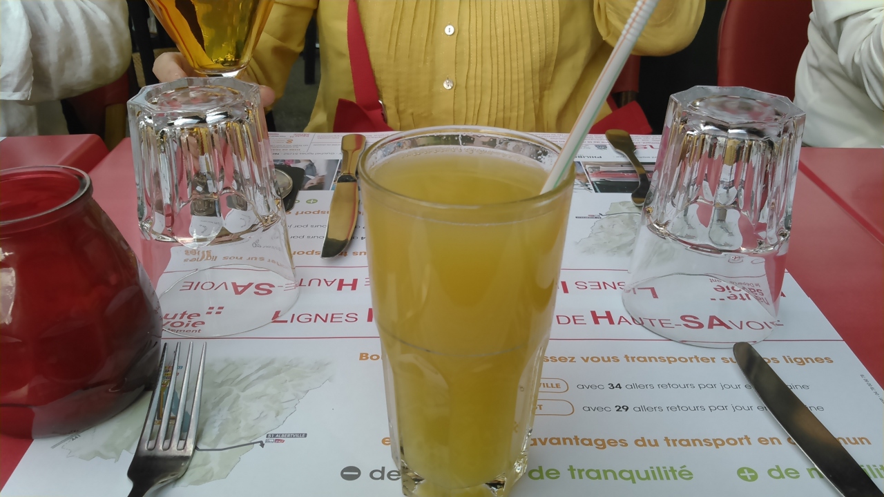 ツアーのディナーで訪問しました。川のすぐそばで、戸外でのお食事でした。メニューはサラダ一人サラダボール半分、タルティフレットという、ゆでジャガイモとベーコンとチーズをオーブンで焼いたものの2コース。パイナップルジュースは3.9ユーロでした。