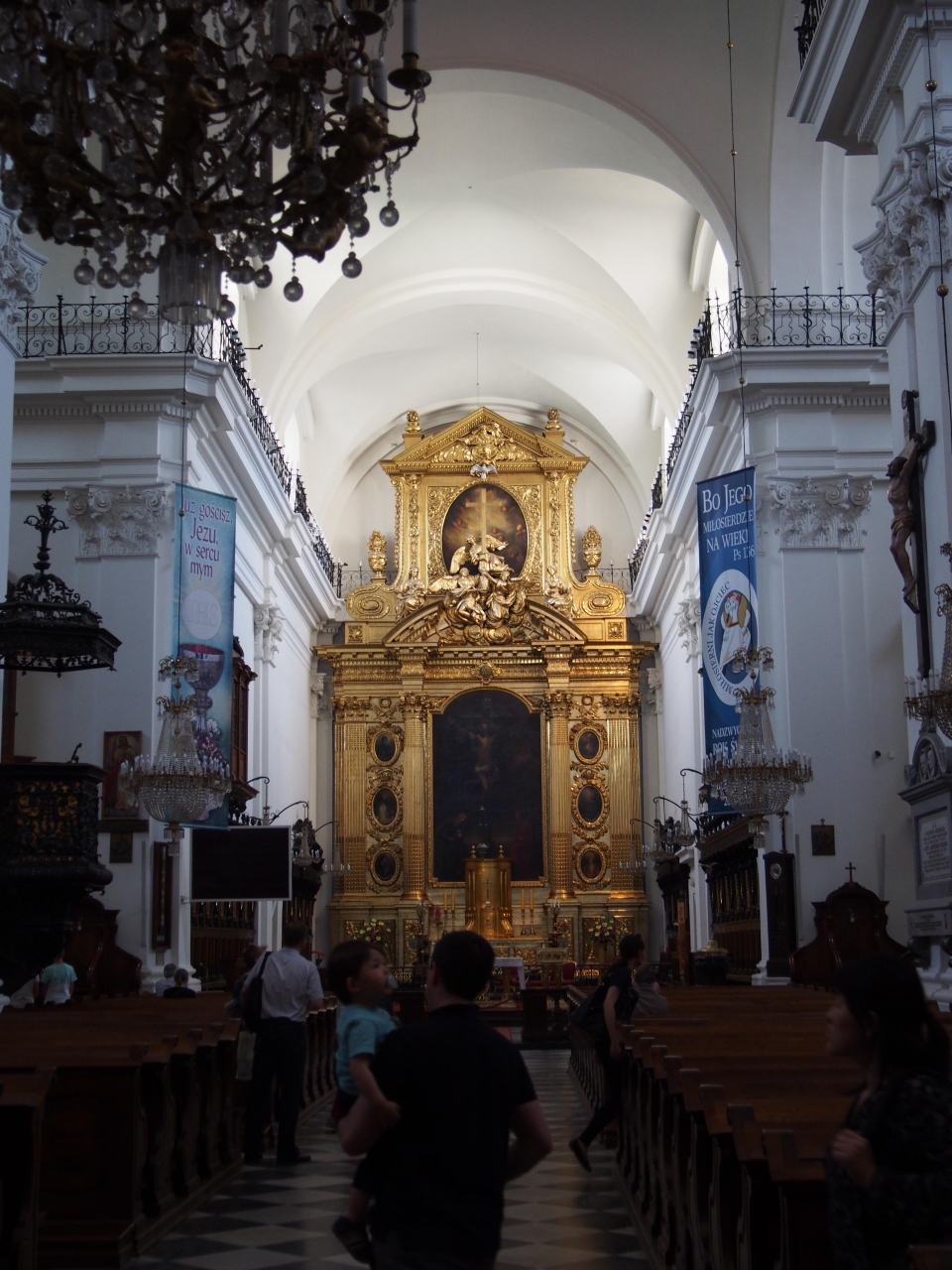 新世界通りの先に2つの塔を両脇に構えている教会(聖十字架教会)が通り沿いにあります。中へ入ると正面に主祭壇があり、何か特別と言う事は無く白を基調とした厳かな雰囲気です。但し、入ってすぐ左の白い柱に見学者がおり記念写真を撮っている、そこがショパンの心臓が埋められている柱ですがそれも特別と言う感じではありません。
