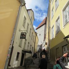 聖ニコラス教会からトームペア地域にむけて行く際に、リュートゥり通りを数10m北上したあと、このリュヒケ・ヤルク通りの坂道を上がります。階段もあって、かなり急な坂道になっています。坂の途中にはお土産物屋さんやブティックなどのお店があります。