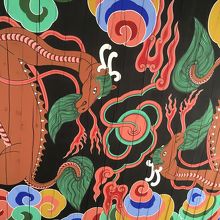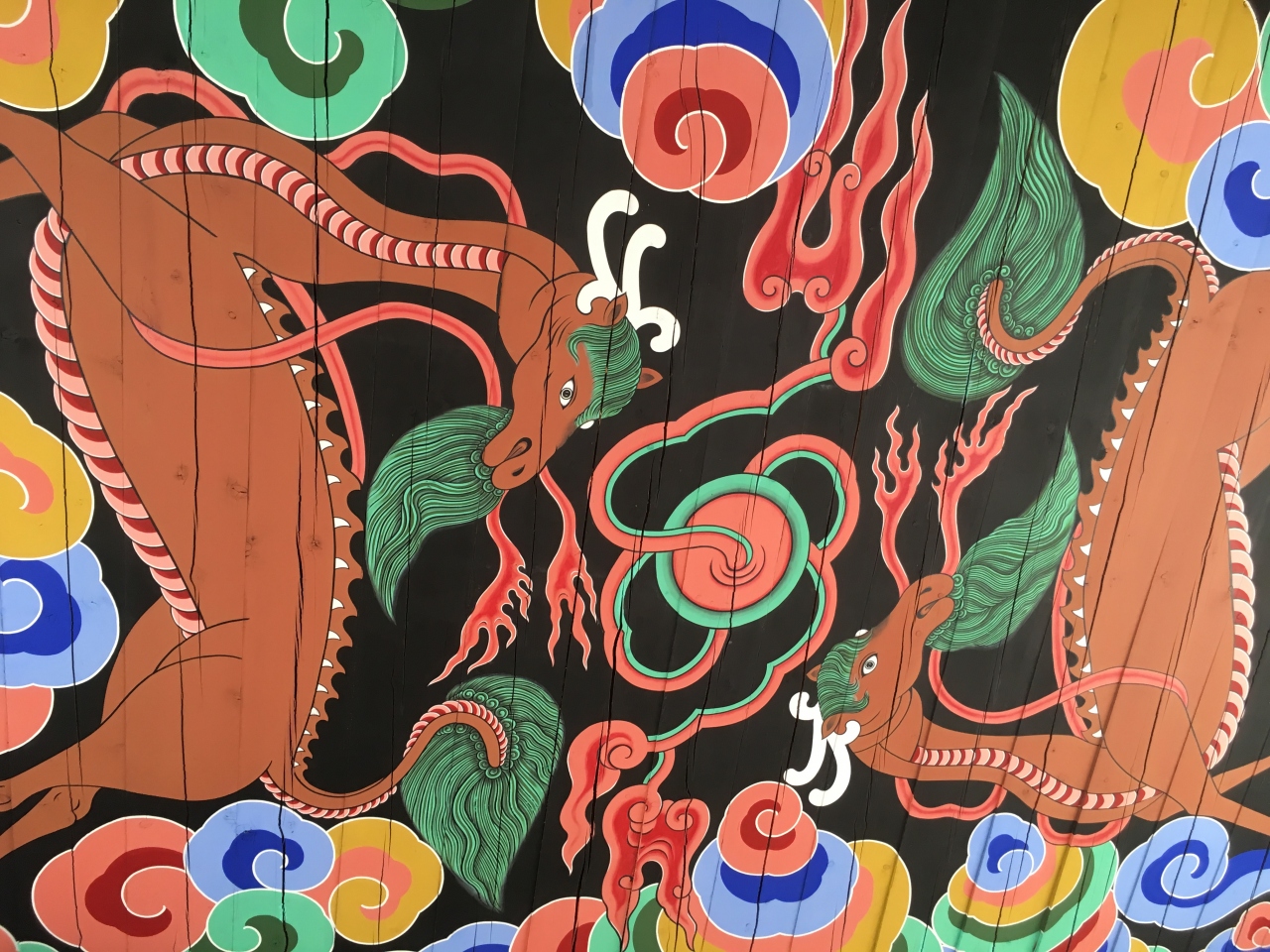 門をくぐるとき天井を見上げると、見事な色彩の絵が描かれています。