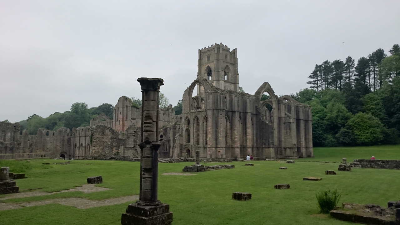 広い公園の中にかつてイングランド最大級の修道院だった廃墟があり、小さな博物館やカフェもあるので散策しながら一日過ごせます。駆け足で行っただけでも全部で2マイル近く歩きますが、道は整備されてます。ビジターセンター近くに広い駐車場があってエントランスのところにあるビジターセンターで入場料を払い地図を貰って入ります。お勧めコースを教えてくれます。ビジターセンターを出て歩いていると遠くに塔のてっぺんが見えそこまでなだらかな丘陵を歩いて行くと修道院の廃墟を見渡せるところがあります。修道院跡の近くに小さな小屋がありそこでは修道院の説明などがあるのでそこに行ってから見学するとただの廃墟が面白く感じられるかもしれません。イギリス人はのんびり公園散策と歴史を同時に家族で楽しんでいるようでした。ミシュラングリーンガイド3つ星、世界遺産ですが、歴史や教会建築などに興味がなければ面白くないかもしれません。