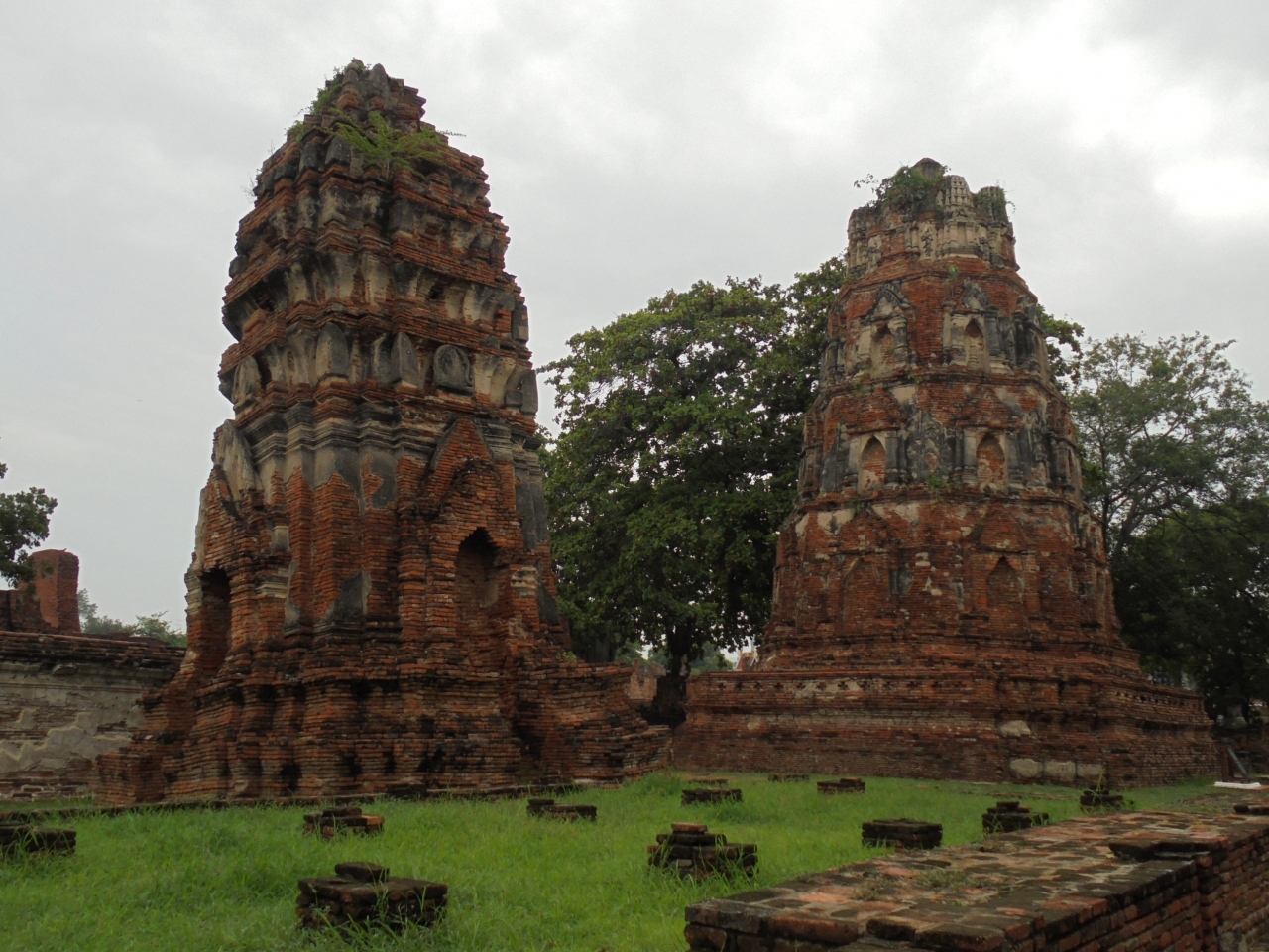 古都アユタヤの中で重要な遺跡の一つに挙げられるワット・プラ・マハタートです。観光ガイドでよく紹介されているのが、木の根にはまり込んだ仏頭です。実際には、それほど大きくはないです。人の顔を2割ほど大きくしたサイズで、上の木からツタが何本か垂れ下がっています。この寺院跡には数多くの仏塔が建ち並んでいて見る人を圧倒させてくれます。首のない座仏像も数多く鎮座しています。アユタヤ観光では絶対に見逃せない観光スポットです。