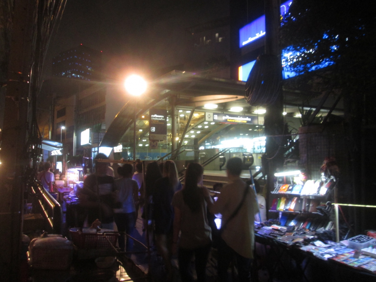 タイランドカルチャーセンター駅の4番出口前に露店が並んでいました。22時の時点でかなりのお客さんが買い物に訪問していました。定番の屋台やオープンスタイルのレストランもあり、夜遅くまで賑わっていました。